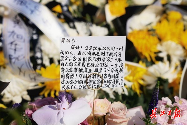 2025年2月10日上午,黄旭华院士遗体送别仪式在武汉市武昌殡仪馆举行。来自全国各地的社会各界人士来到现场悼念,鞠躬献花;一些无法来到现场的民众则下订单请外卖小哥送来鲜花。大量鲜花在殡仪馆内外摆成一排又一排,不少送花群众会附上一段感情真挚的话,致敬黄老,寄托哀思。