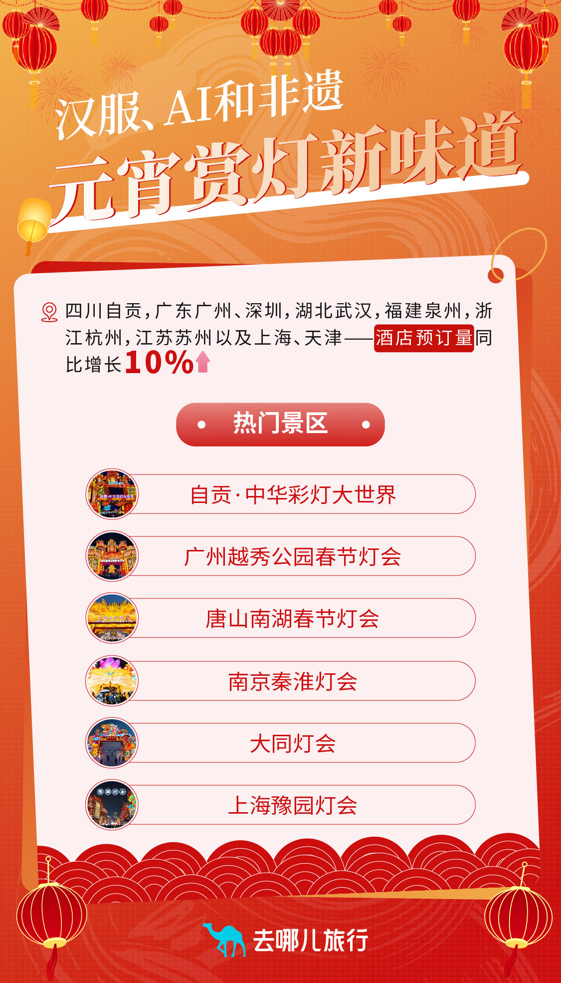 没出正月就是年,今年元宵节恰是“非遗春节”后的首个传统节日,喜庆、热闹的节日氛围仍在延续,元宵灯会融入“非遗”,带动了文旅市场。在去哪儿平台上,“灯会”主题的景区门票预订量同比增长近二成,热门景区为自贡·中华彩灯大世界、南京秦淮灯会、广州越秀公园春节灯会、大同灯会、唐山南湖春节灯会、上海豫园灯会等。