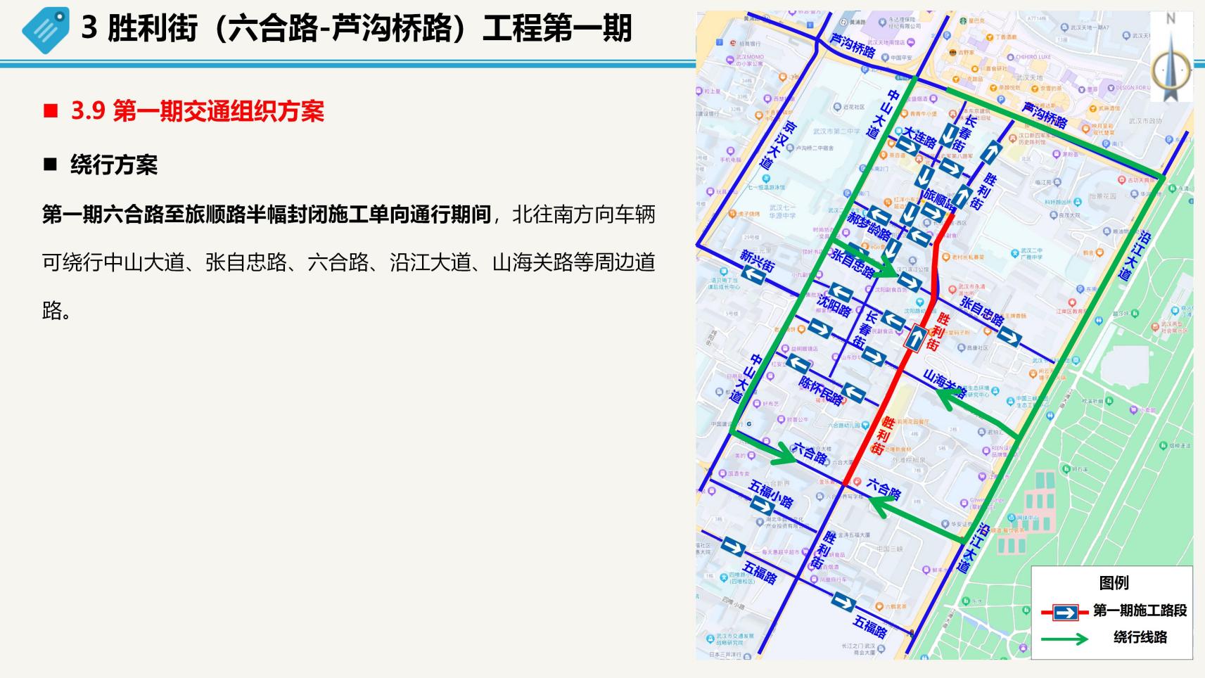 一、胜利街(六合路至旅顺路)机动车单向通行。北往南方向机动车可绕行中山大道、张自忠路、六合路、沿江大道、山海关路等周边道路。