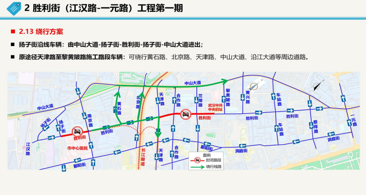 二、胜利街(扬子街至南京路)禁止机动车通行,市中心医院及扬子街沿线车辆可绕行黄石路、保华街、中山大道、扬子街等周边道路。