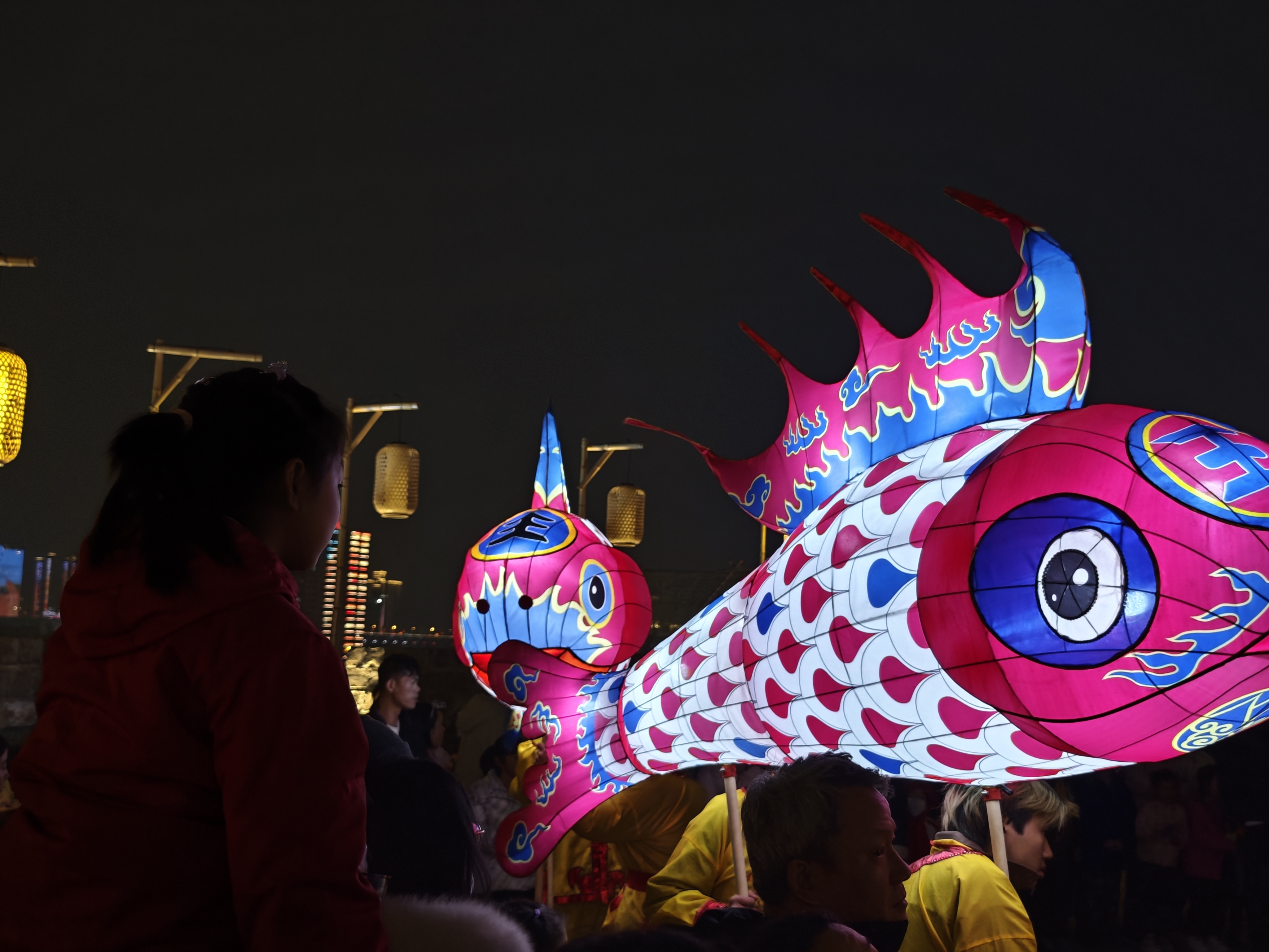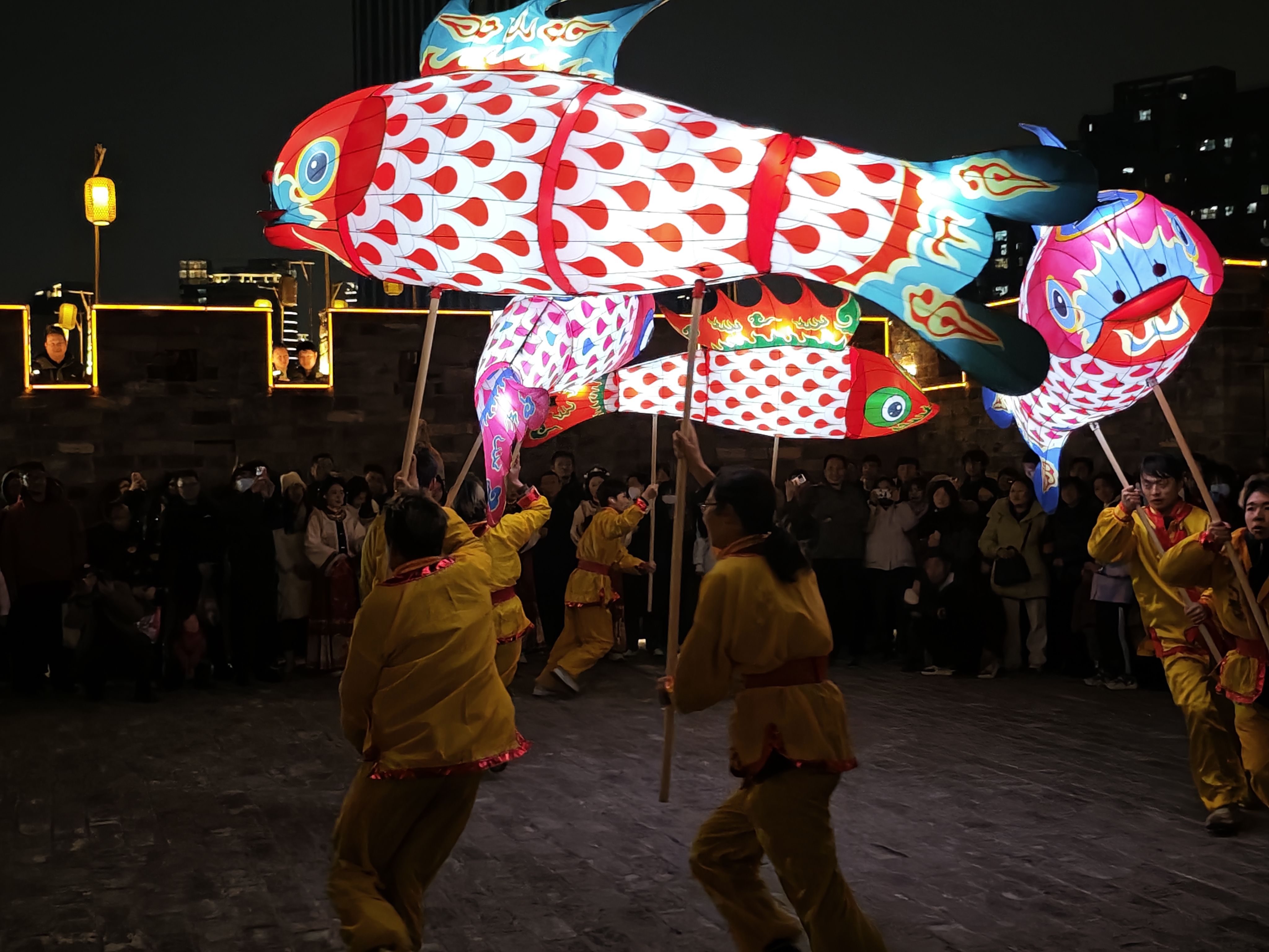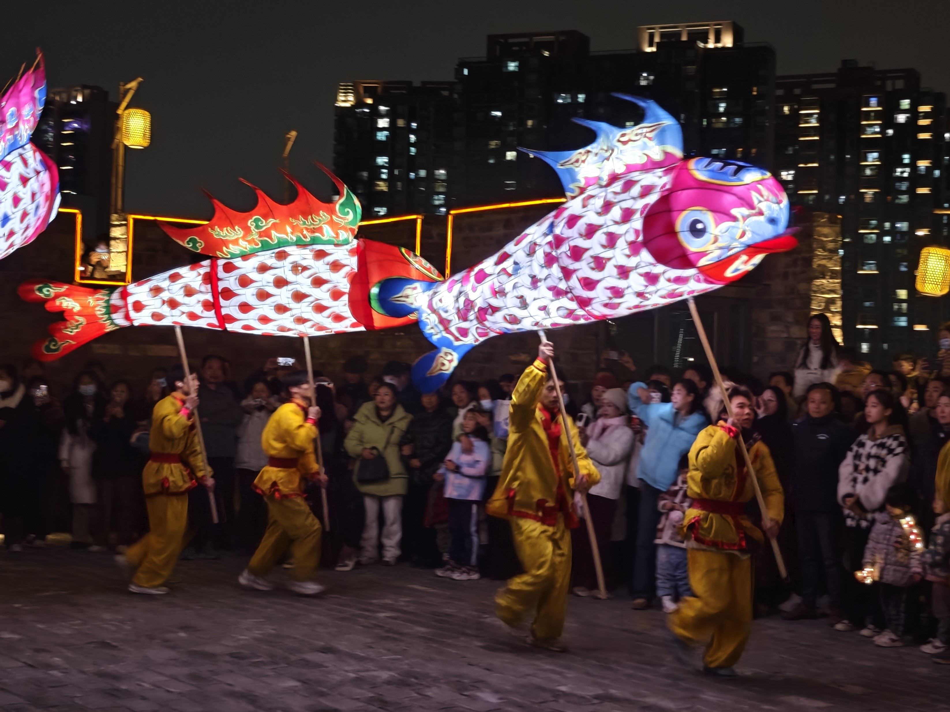 巡游队伍蜿蜒于灯火璀璨的城墙之上,随着鼓点节奏加快,表演者迈出矫健步伐,四只鱼灯犹如水里的鱼儿般四处游弋,引得观众阵阵叫好。“摸摸鱼头,万事不愁!”表演结束后,观众争相上前触摸鱼灯祈福,和鱼灯合影留念,与表演者互道节日祝福。当天的表演者是由昙华林园区商户员工经过集训后组成的年轻队伍,平均年龄在25岁左右。