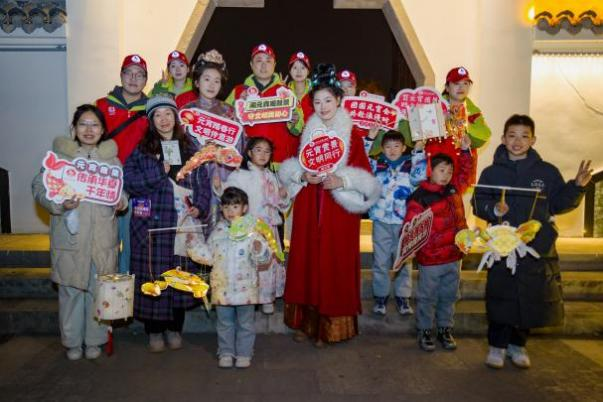 身着精美汉服的文旅志愿者,带着游客共同参与猜灯谜活动。
