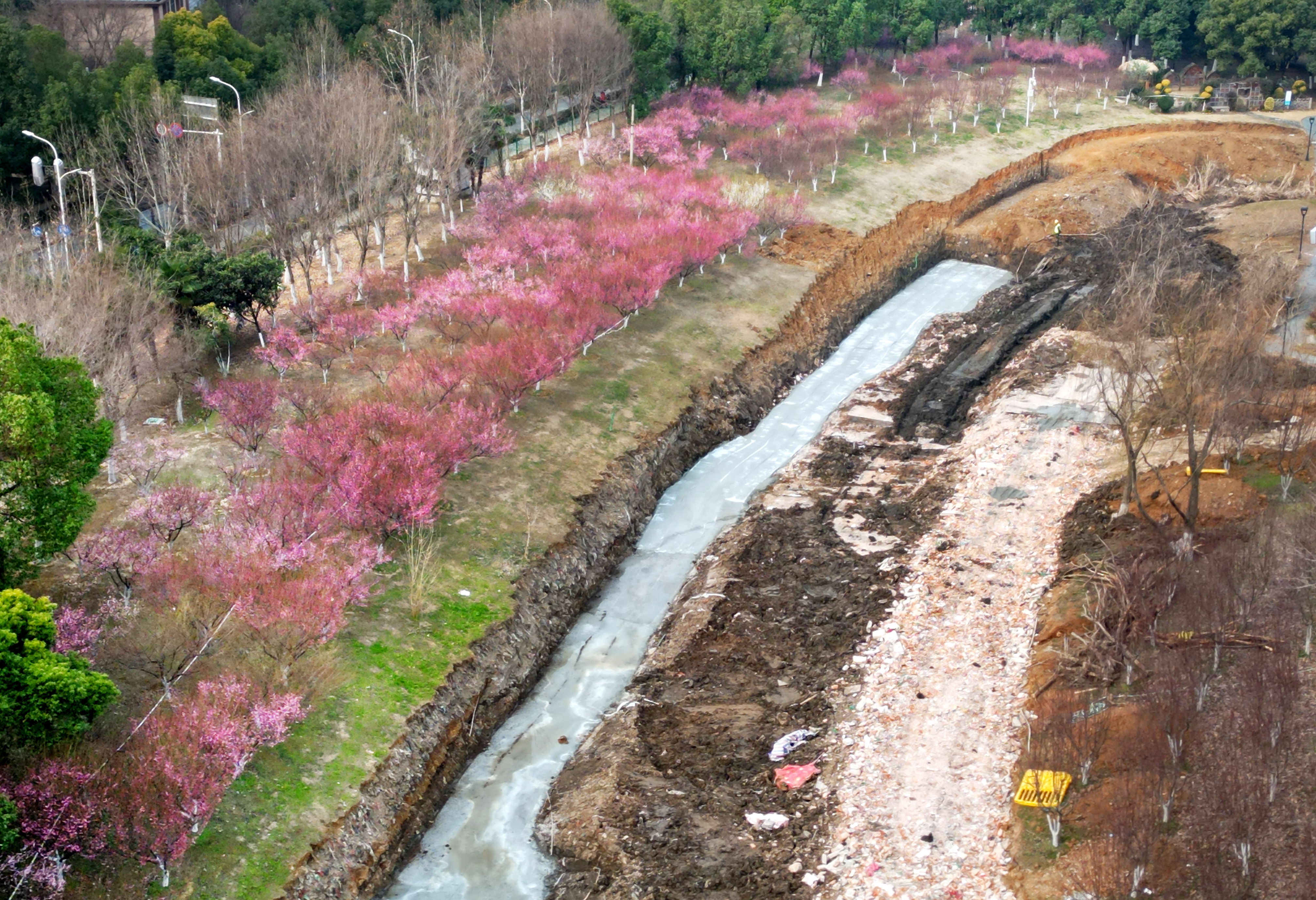 4.环绕月季园的旱溪区域,将改造成长400余米、宽5至10米的水溪,溪中设置多个拦水坝,形成层层叠水景观。保留溪边原有的红梅树林,沿岸新栽桃花和垂丝海棠林,形成特色鲜明的水岸花溪。新修道路和栈桥形成环形游线,与主园路对接。