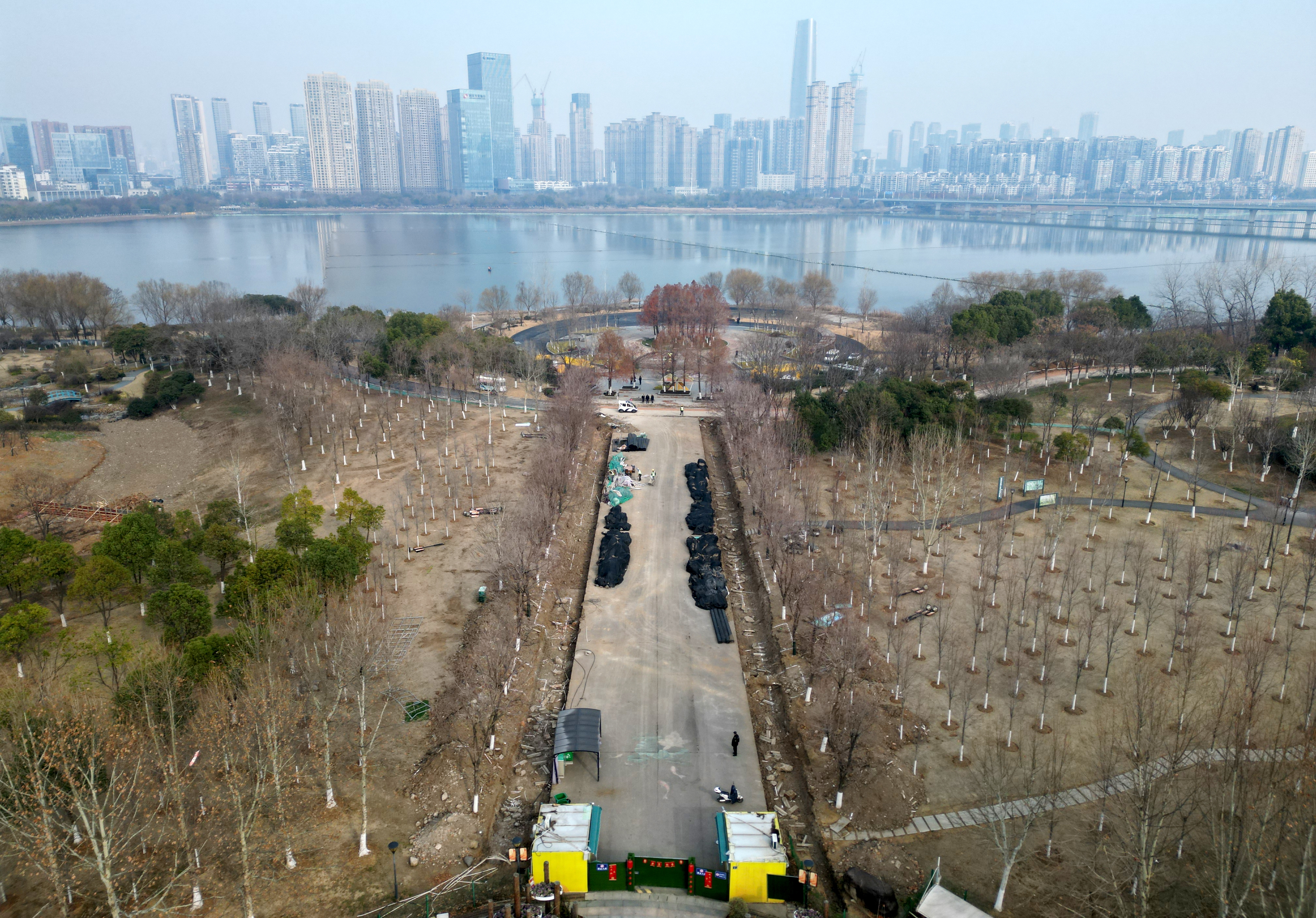 2月13日上午,长江日报记者在沙湖公园C区看到,施工人员正在中轴线、滨水圆形广场、主园路以及月季园附近的旱溪区域,进行园林景观和基础服务设施改造提升。