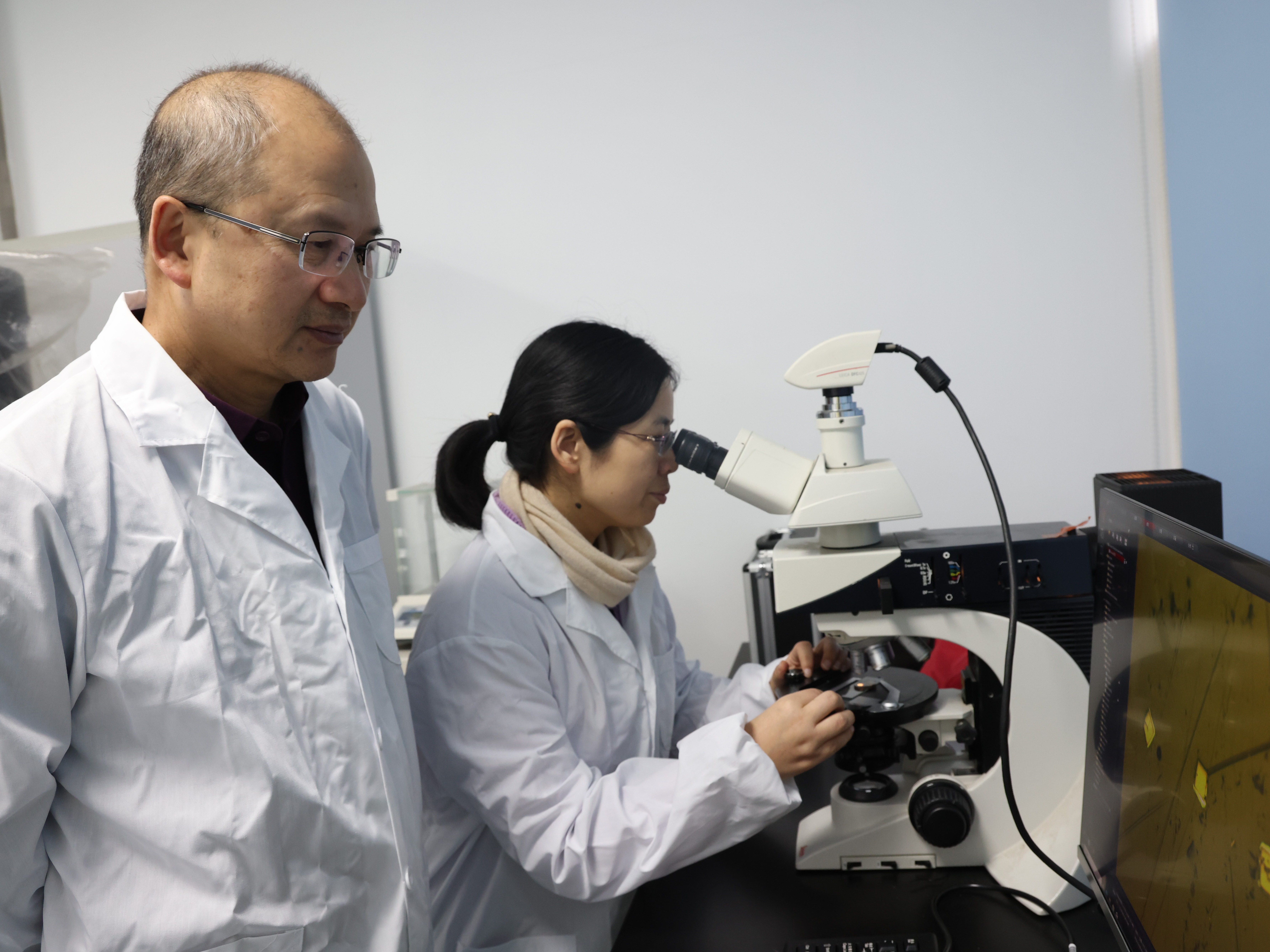 肖龙教授(左一)和何琦副教授在行星地质深空探测湖北省重点实验室做实验。通讯员焦思勤 摄