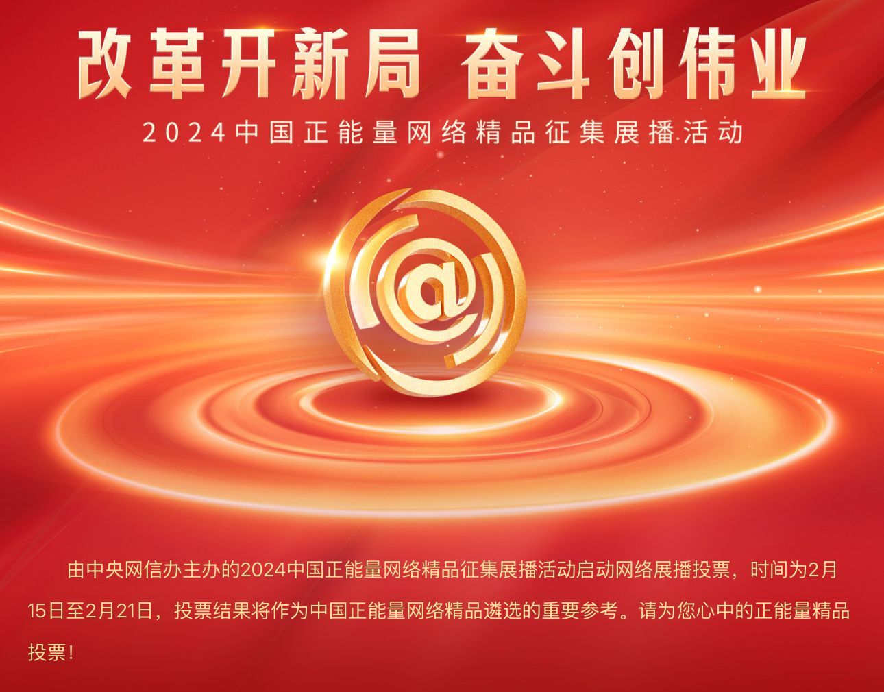 改革开新局,奋斗创伟业。由中央网信办主办的2024中国正能量网络精品征集展播活动,启动网络展播投票,时间为2月15日至2月21日,投票结果将作为中国正能量网络精品遴选的重要参考。