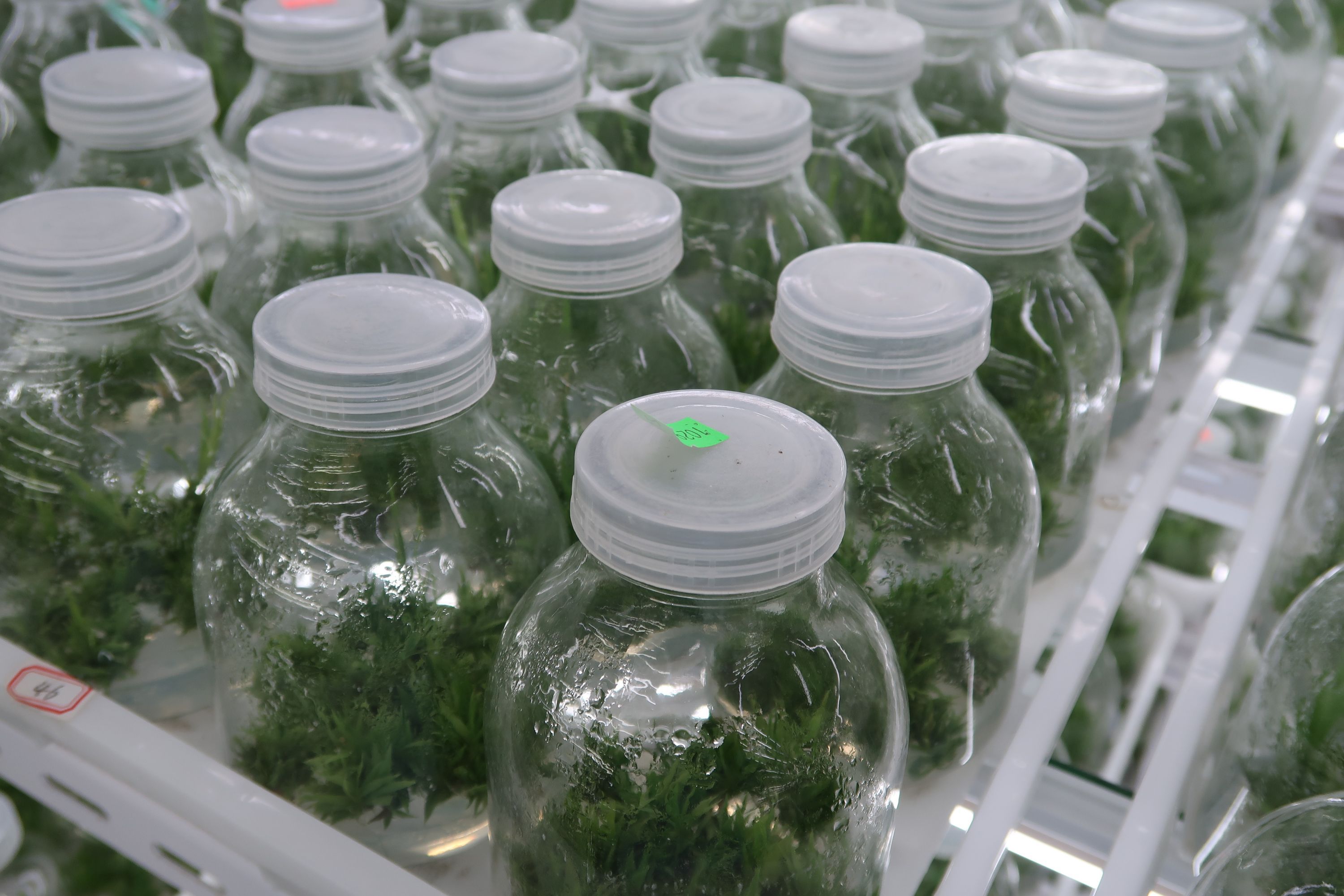 整齐排列着一瓶瓶绿油油的植物,