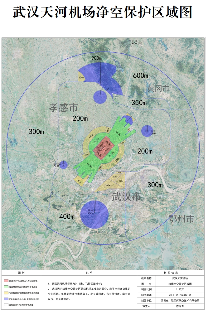 武汉天河机场净空保护区域是指以机场基准点为圆心、水平半径五十五千米的空间区域;