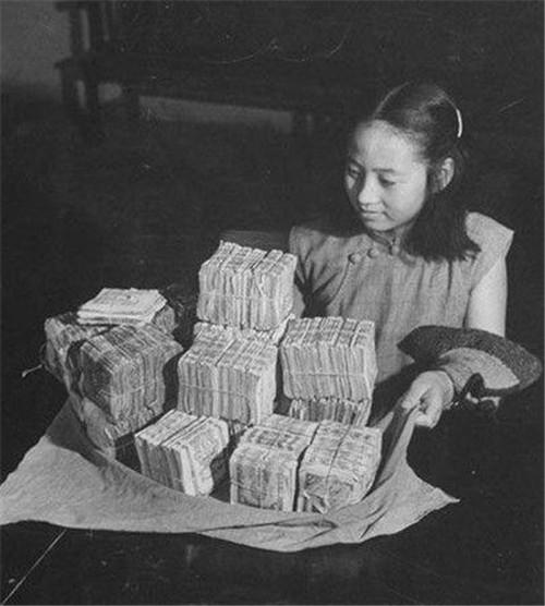 当时通货膨胀严重,这位银行女职员拿着一大捆钞票,购买力却很低。