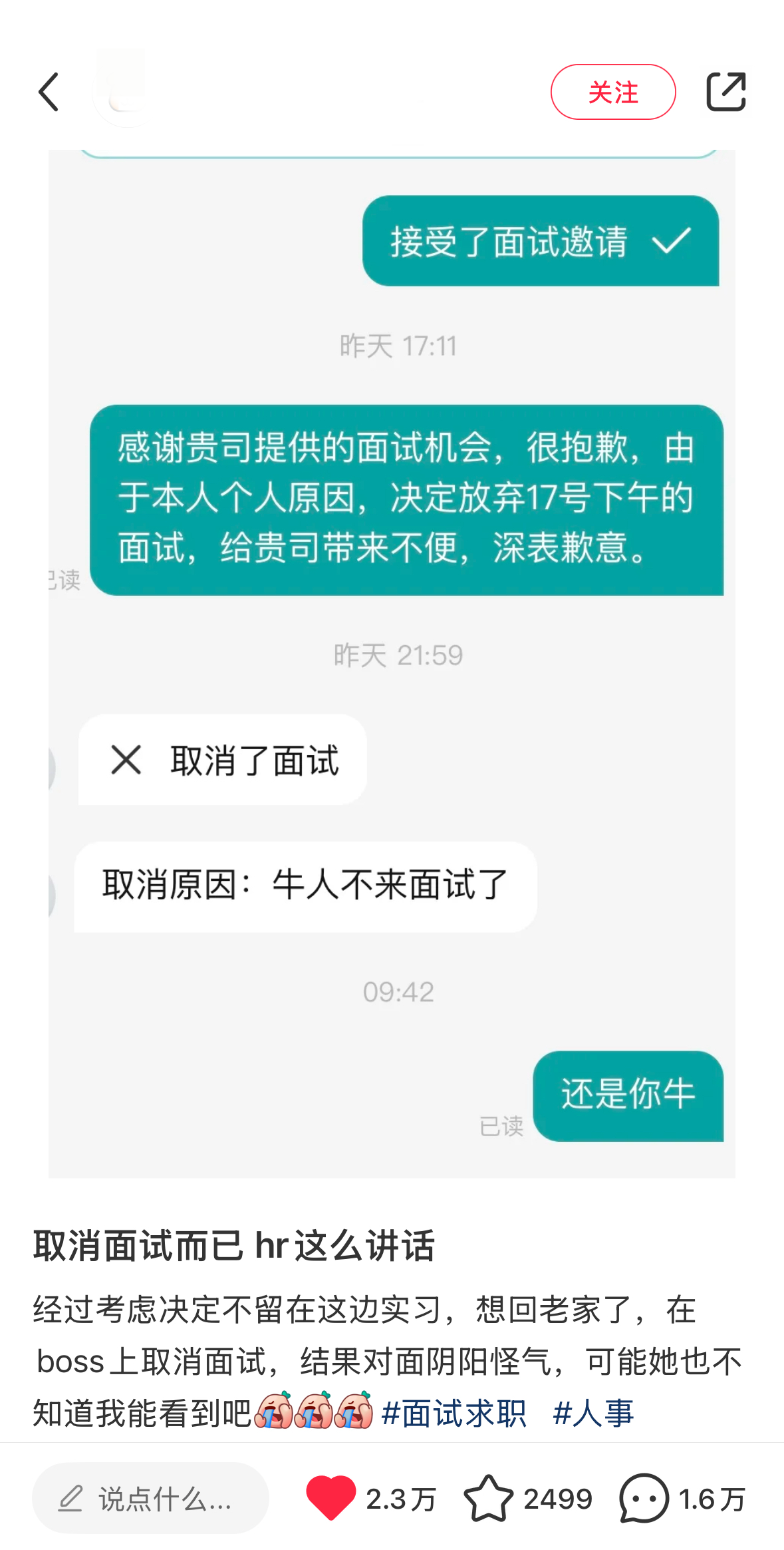 “六六”将上述对话截图上传到小红书平台,一小时后,帖子就收获了近3万点赞。在评论区,不少网友科普称,“牛人”是BOSS直聘对求职者的统称。“看到评论区的回复后,我才知道‘牛人’没有别的意思,我马上就给对方道歉了。”六六表示,虽是误会,但自己还是希望不被冠以“牛人”称号。
