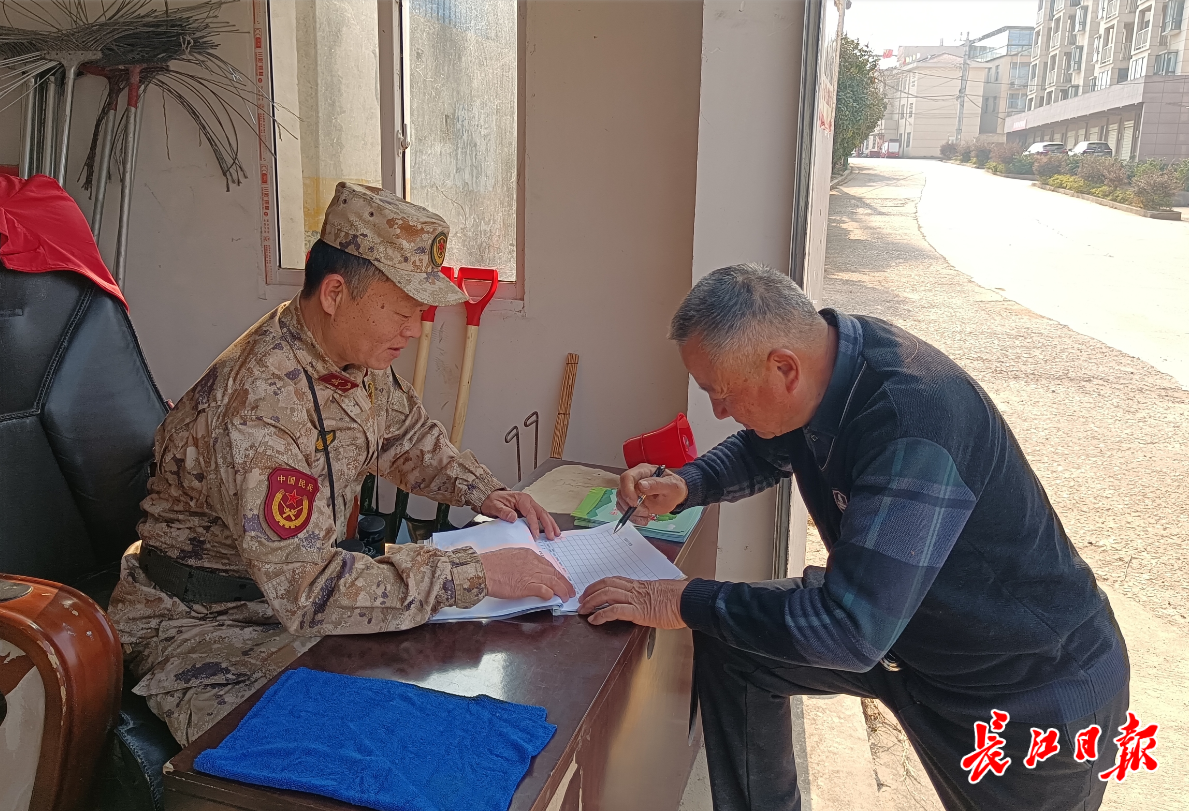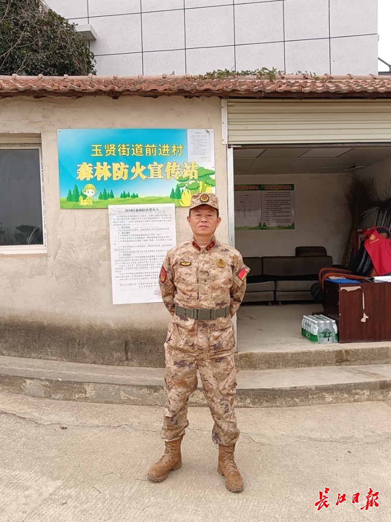 2月19日清晨,长江日报记者驱车前往武汉市蔡甸区玉贤街道前进村森林防火宣传站,见到了正在该站值守的前进村民兵连连长罗军。宣传站位于进入当地盐山林区的道路边,罗军正在给欲进入林区的市民做登记。