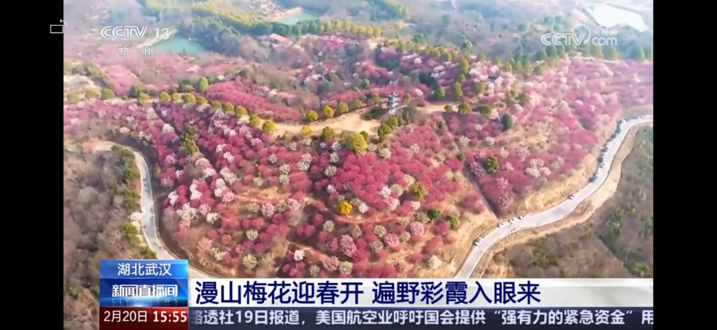 “眼下,湖北武汉的梅花进入盛花期,漫山的梅花竞相绽放,吸引大批游客前来踏春赏梅,感受春日的浪漫与诗意。”2月20日下午,央视《新闻直播间》聚焦武汉梅花盛放季。目前,武汉种植梅花的城市公园和景区有100多座,近10万株梅花已陆续进入盛花期,花期将持续到3月。