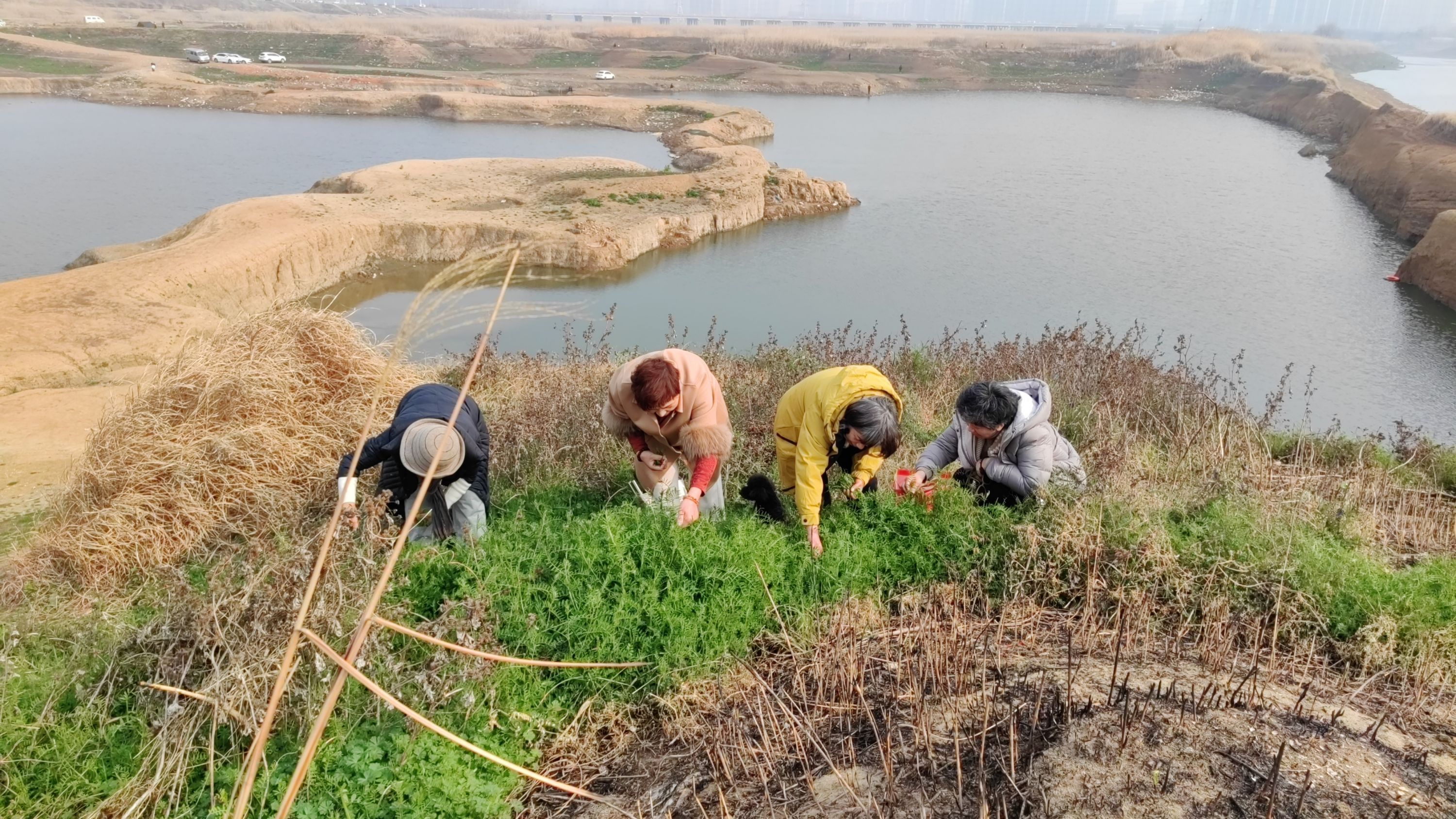 市民在府河河滩采摘野菜,可以看出府河河滩地形复杂。 记者金文兵 摄