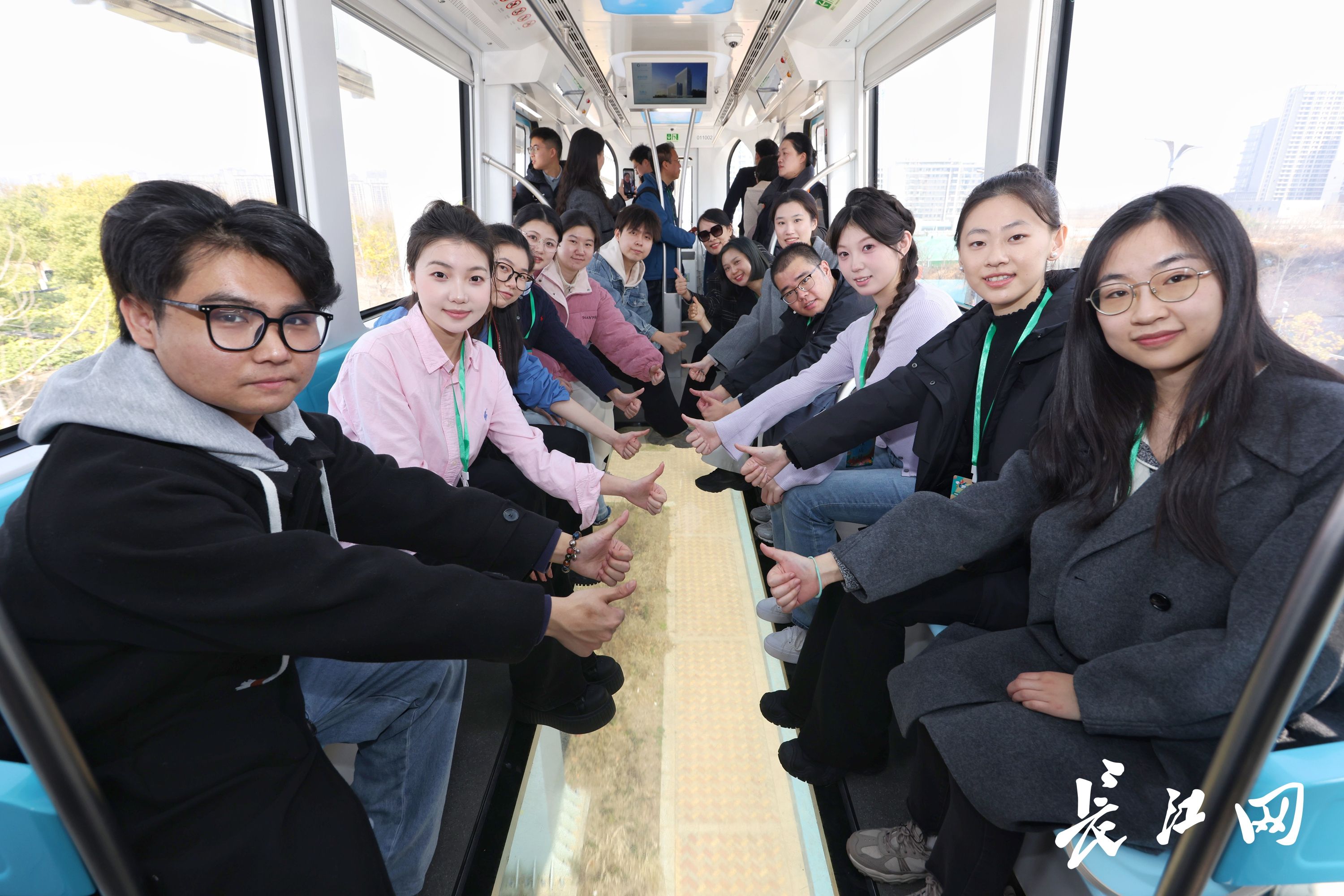 2月27日,“青春华章 我们的回答”网络大思政课·2025全国大学生社会实践团成员走进“光谷光子号”空轨列车。王筝 摄