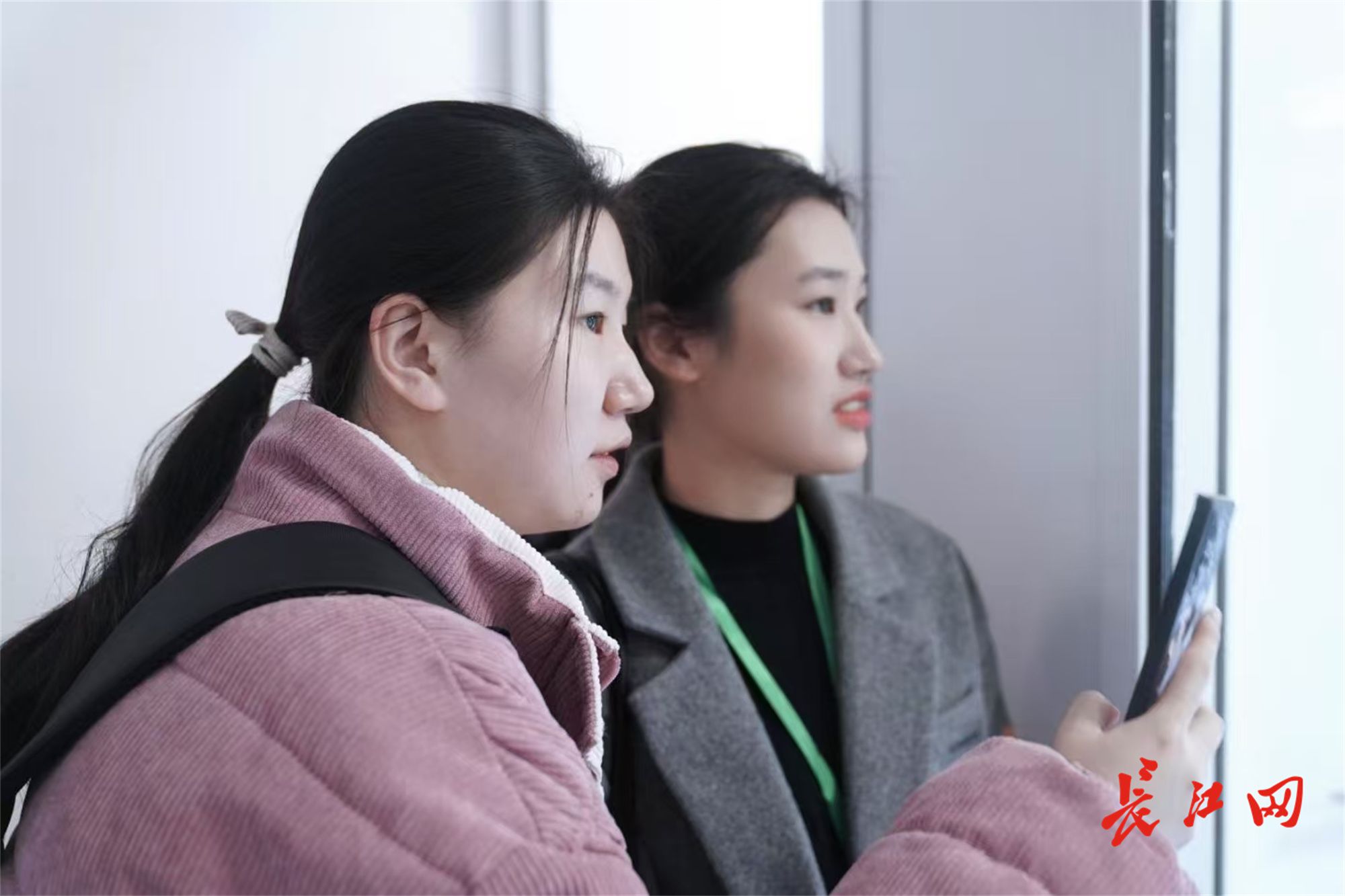 武汉大学遥感信息工程学院2021级遥感科学与技术专业本科生姚恬乐与华中科技大学马克思主义学院2024级马克思主义中国化专业研究生吴心旖在实验室外观摩。王筝 摄