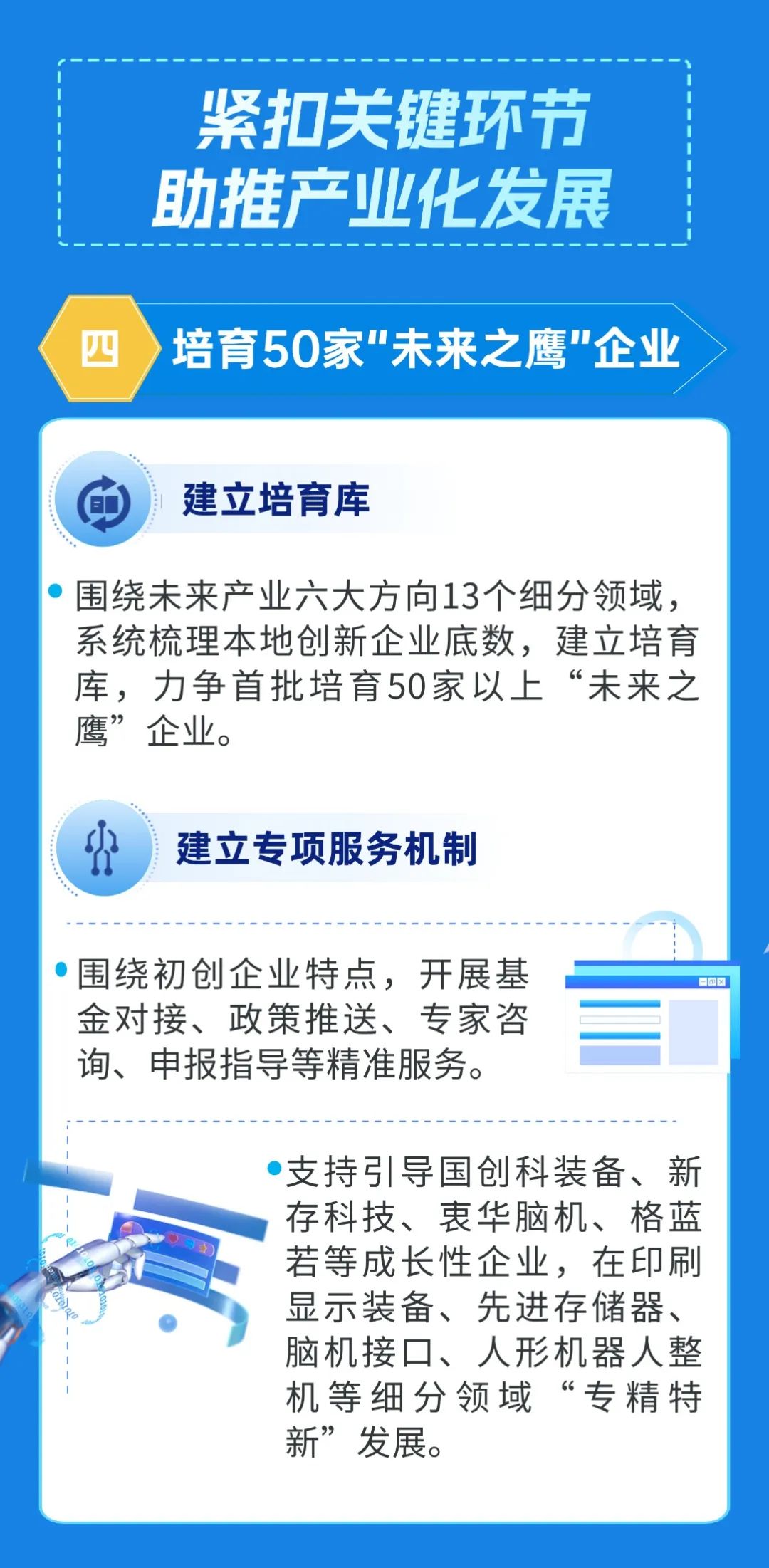 据《清单》,武汉将聚焦未来显示、先进半导体、通用人工智能等多个前沿领域,通过技术突破、平台建设、产业培育等多维度举措培育未来产业。武汉力争首批培育50家以上“未来之鹰”企业,为初创企业提供精准服务,支持引导一批成长性企业,在印刷显示装备、先进存储器、脑机接口、人形机器人整机等细分领域“专精特新”发展。