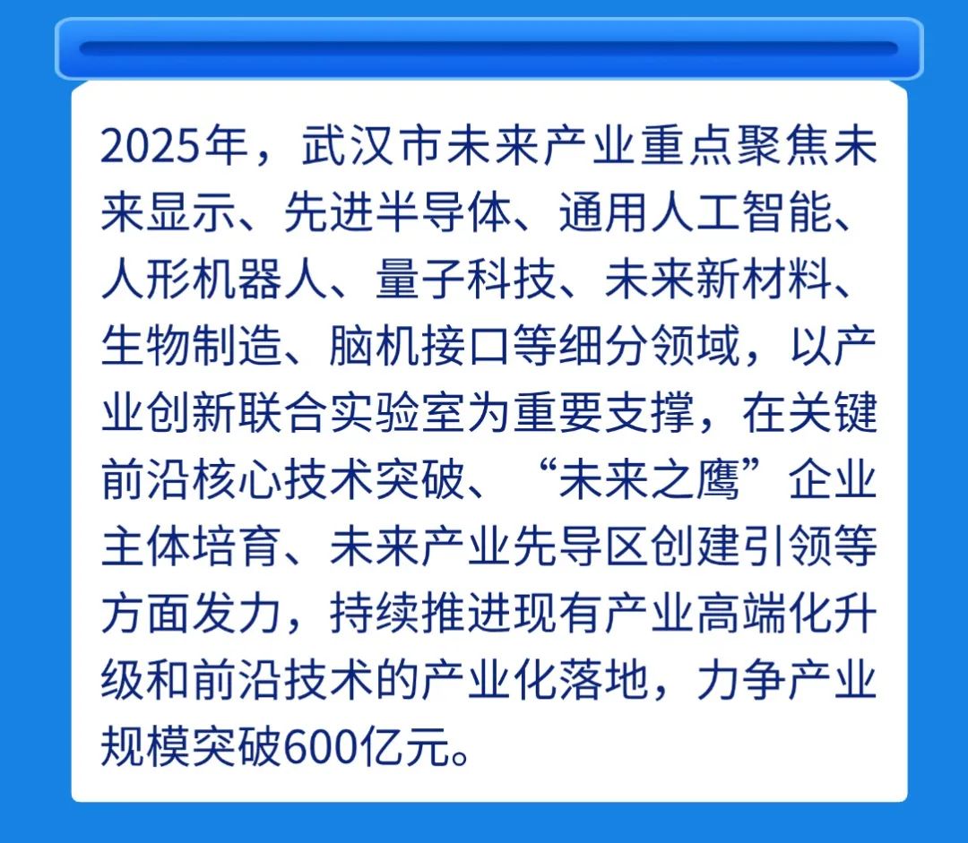 长江日报大武汉客户端3月4日讯(记者李佳 通讯员武经宣)千米高空上,老鹰精准锁定地面猎物;激烈市场中,“未来之鹰”凭借敏锐洞察锁定未来。近日,武汉市推进新型工业化领导小组办公室印发《2025年武汉市未来产业创新发展工作要点及重点任务清单》(以下简称《清单》),今年要培育50家“未来之鹰”企业;全年力争产业规模突破600亿元。