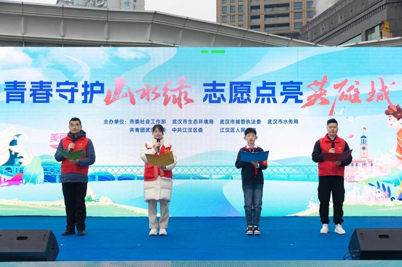 市生态环境局“武小环”志愿服务队代表张强、市城管执法委“金牌宣讲团”成员王霞、市水务局“江城河小青”志愿服务队红领巾志愿者张郡熙、中国青年志愿者优秀个人奖获得者余进文等4位青年志愿者代表在活动中发出倡议,号召广大青年积极投身志愿服务,践行绿色低碳生活方式,共同守护武汉的绿水青山。