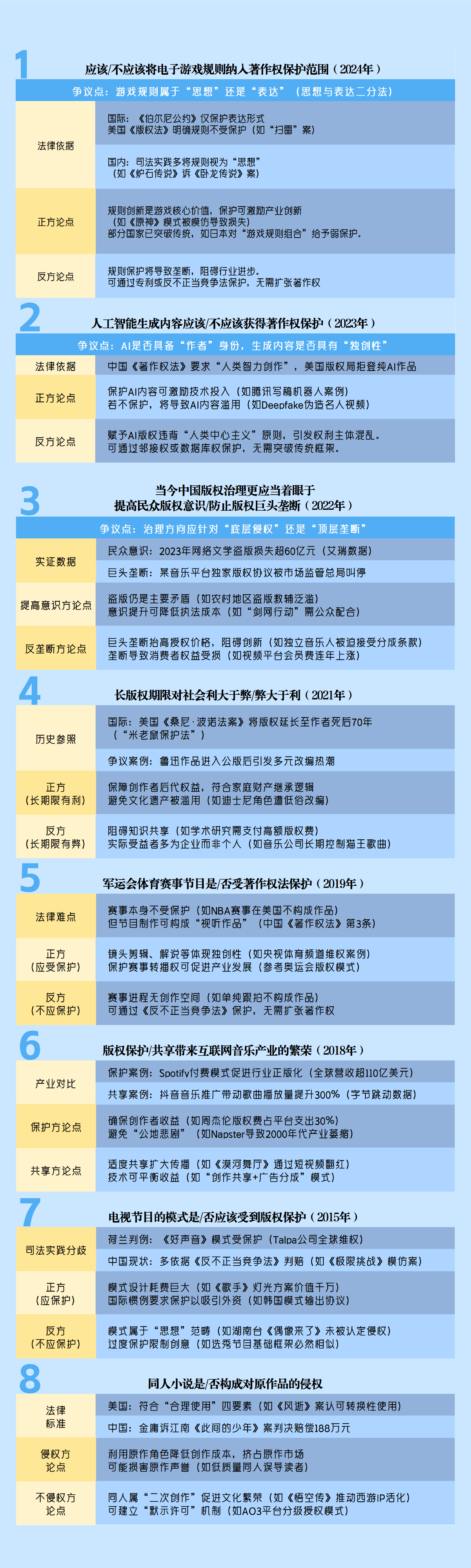 一直以来,“法理争鸣”高校版权辩论赛的辩题都围绕版权领域的前沿争议和社会热点展开,具有鲜明的时代性与专业性。在积极向广大网友征集新鲜辩题的同时,我们特别整理了往届赛事中引发热烈讨论的经典辩题,帮助大家开阔思路、激发灵感。