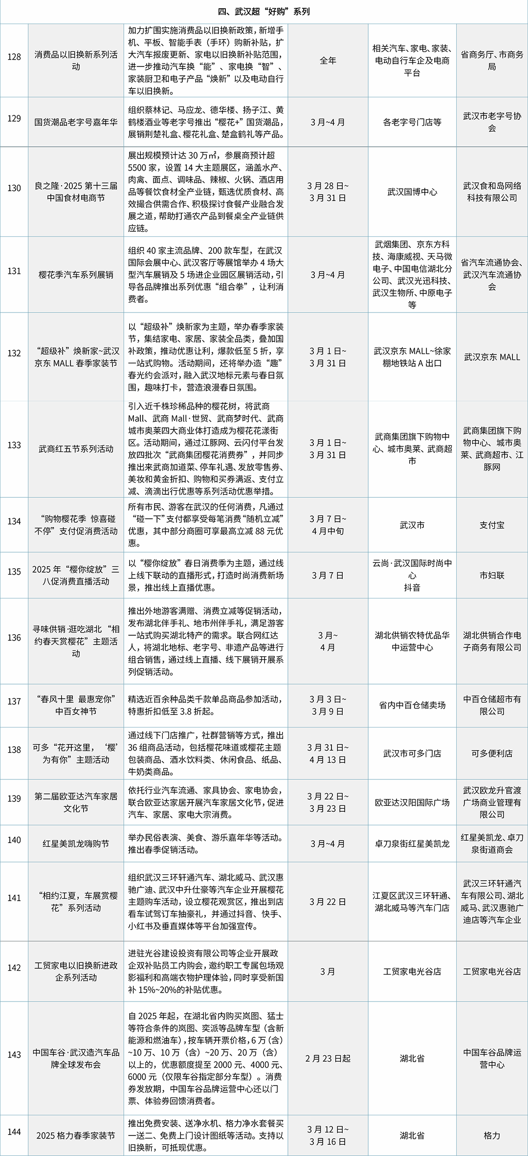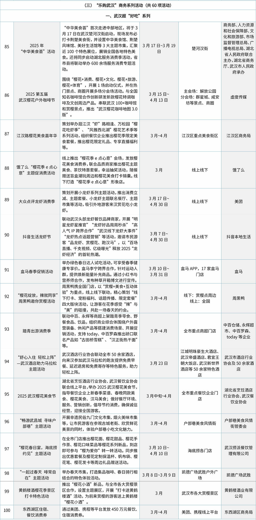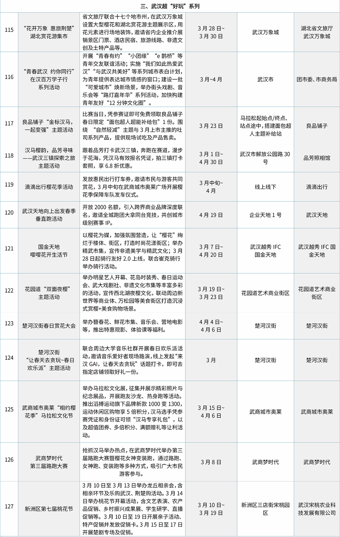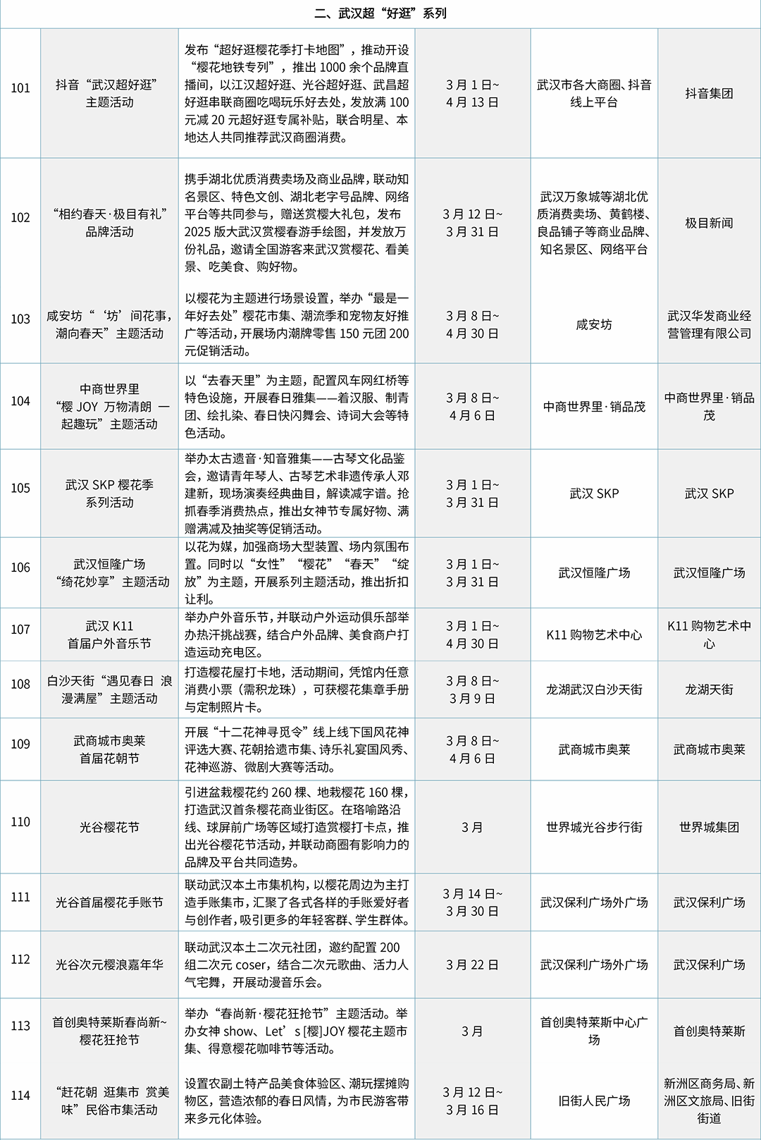三是“乐购武汉”商务系列。包括武汉超“好吃”、超“好逛”、超“好玩”、超“好购”四大板块60项活动。如中华美食荟、第十三届中国食材电商节、K11户外音乐节、樱花季汽车展销、武商红五节、京东MALL春季家装节等。