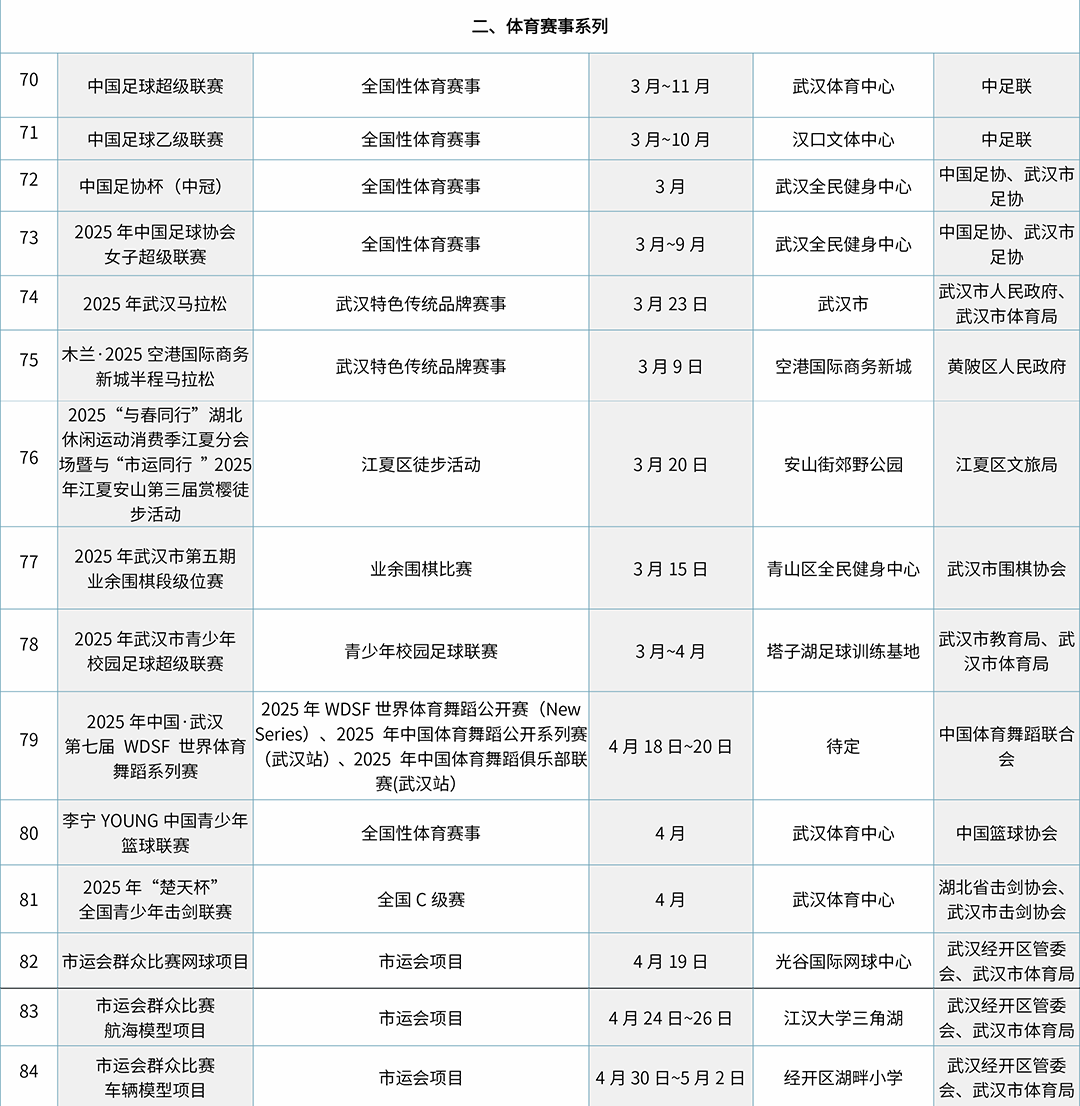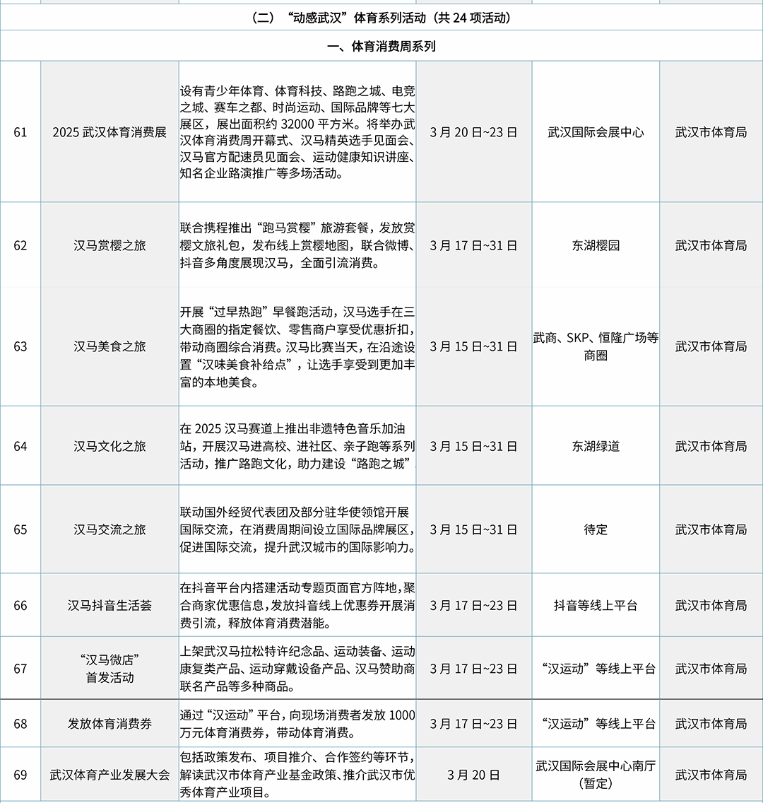 二是“动感武汉”体育系列。包括武汉马拉松、武汉体育消费周等20多项体育活动。3月23日武汉马拉松开跑,3月17—23日举办武汉体育消费周。其间,赏樱季、汉马、商业助消费多方联动,赛事与商业、赏花、美食、音乐融为一体,有汉马美食生活节、非遗特色音乐加油站、赛事特色直播等。