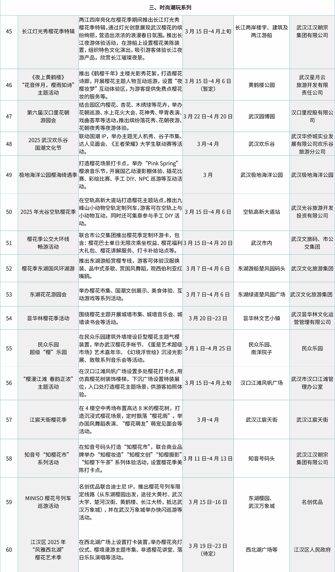 一是“浪漫武汉”文旅系列。主要有浪漫赏花、观演看展、时尚潮玩三大板块60项活动。