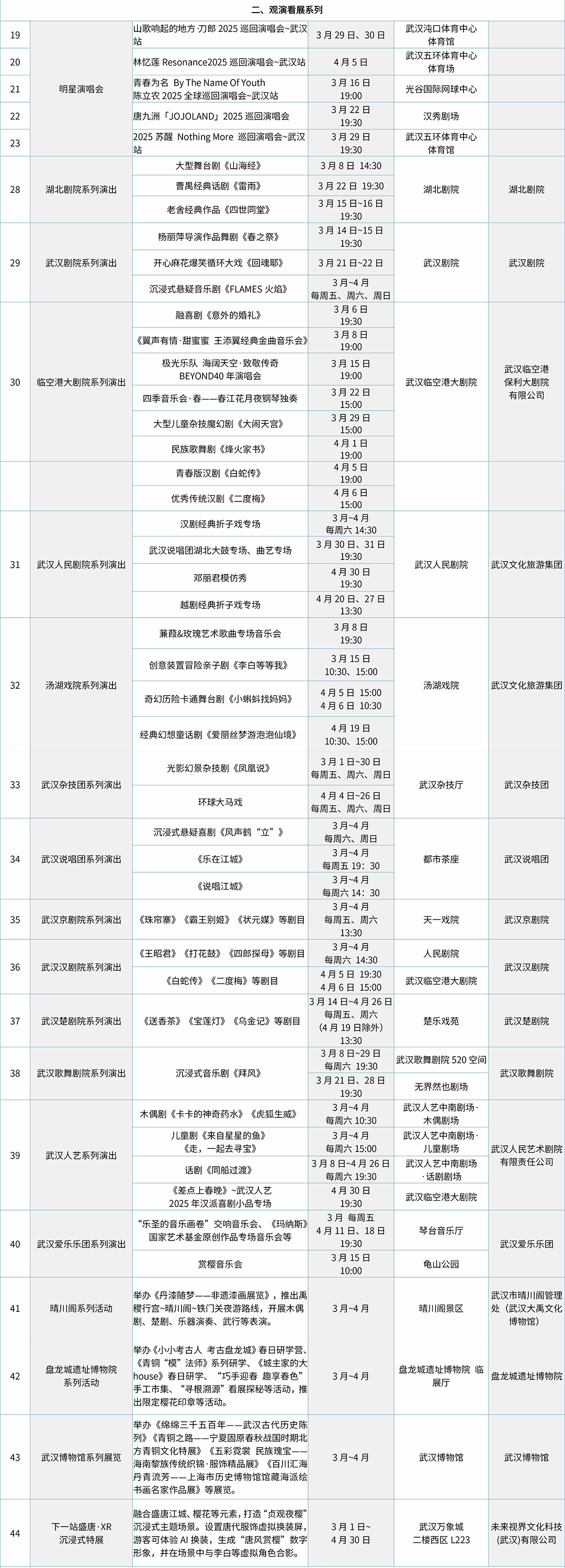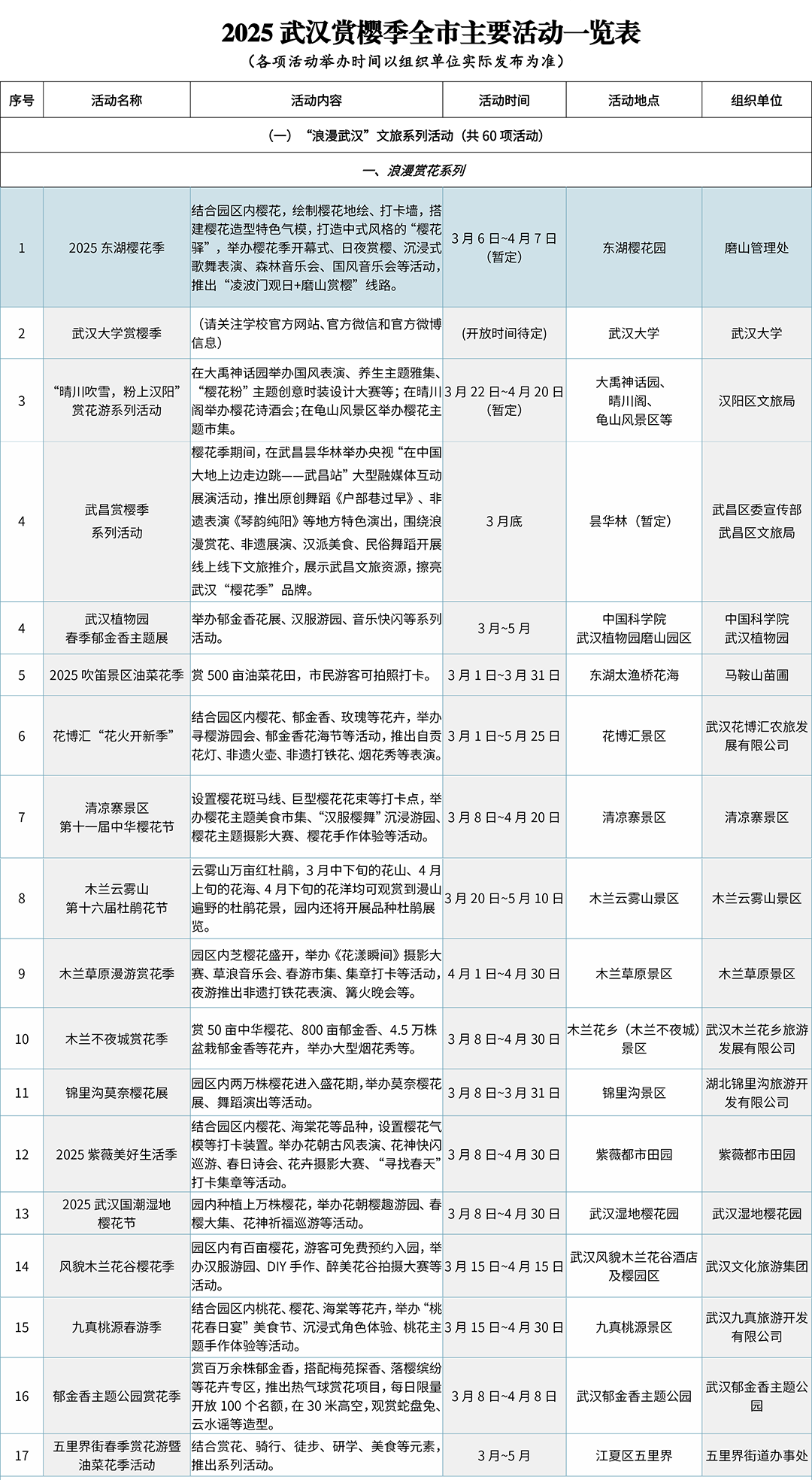 各类活动精彩。赏樱季期间,拥有最美跑道的武汉马拉松3月23日开跑,2025年“中华美食荟”盛大展销,刀郎、林忆莲等艺人在武汉开演唱会,琴台大剧院、汤湖戏院等各大剧院好戏连台,湖北省博物馆、武汉博物馆、晴川阁等文博场馆的各类主题展,奉起文化盛宴。城市音乐快闪联动赏樱点及特色街区,推出花海音乐会、街头音乐快闪,“樱花+音乐”,为赏花之旅提供惊喜邂逅。