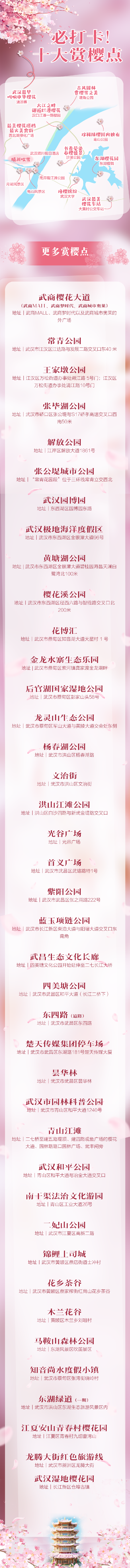 武汉市文化和旅游局相关负责人介绍,赏樱季期间,为给广大游客提供更好的赏花体验,全市整合文旅体商演全域要素,打造“浪漫武汉 一路生花”主题,推出文旅、体育、商务、招商四个系列100多项活动。其中,“浪漫武汉”文旅系列主要有浪漫赏花、观演看展、时尚潮玩三大板块60项活动。今年赏樱季活动相较往年,内容更丰富,活动更精彩,景更美、点更多,吃、住、行、游、购、娱一站式全链条,市民和游客将有更多选择。