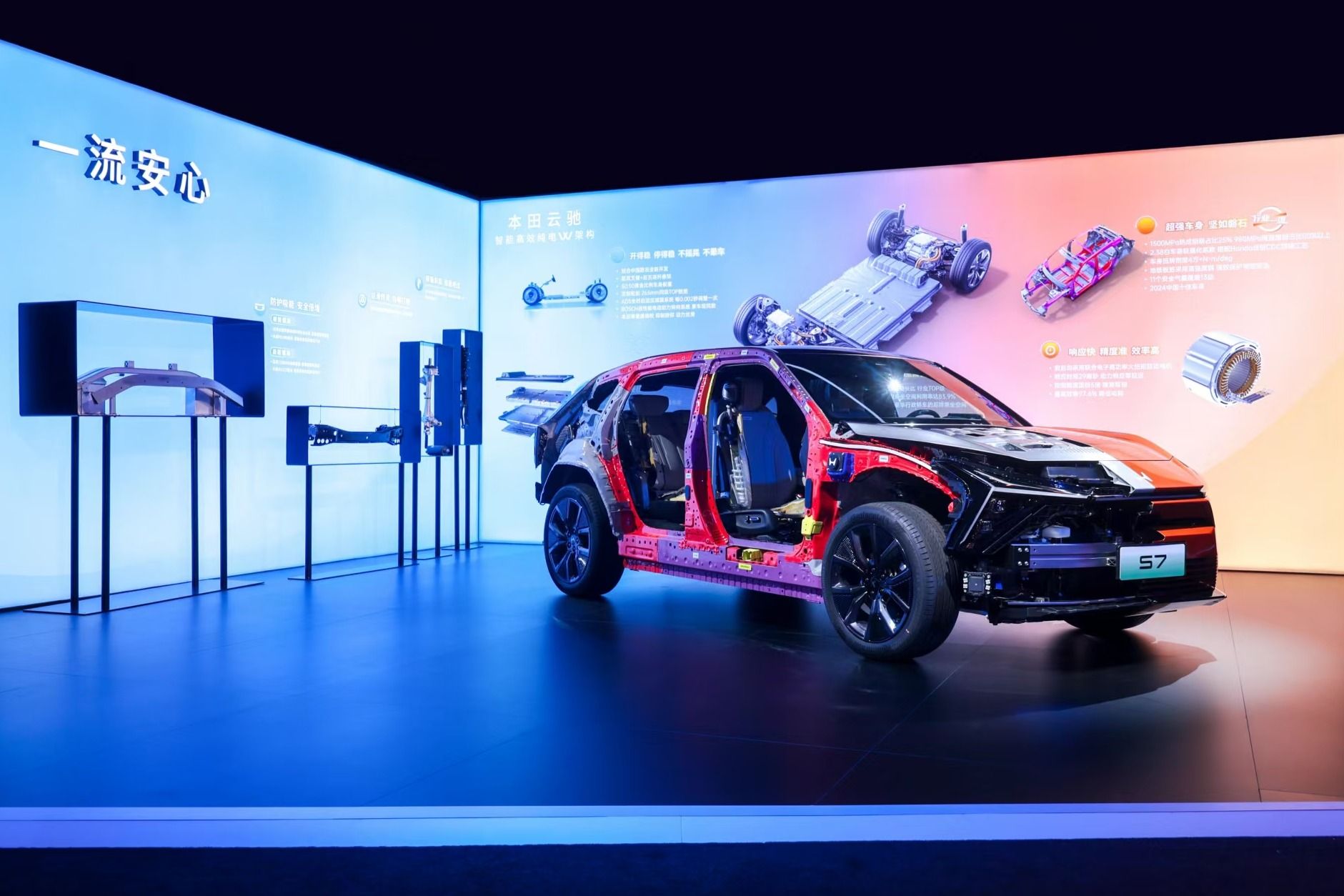 走进东风本田S7全球首拆现场,映入眼帘的是一幕极具冲击力的画面:一台崭新的蓝色S7与另一台被“解剖”至车身结构的同款车并置。“真材不怕测,实料不怕拆。”东风本田汽车有限公司新车型中心工程师罗露介绍,安全是东风本田S7设计的核心要素。