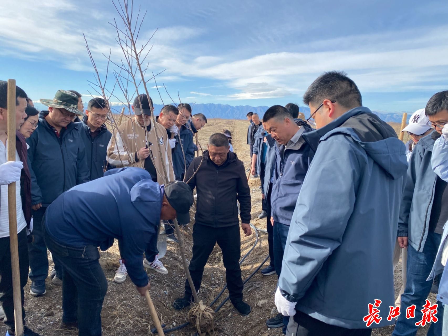 2024年4月,位于新疆博乐市万亩海棠园的“我家新疆有棵树”基地,博乐市林业专家指导武汉援疆工作队队员种植果树。(资料照片)长江日报记者 胡义华 摄