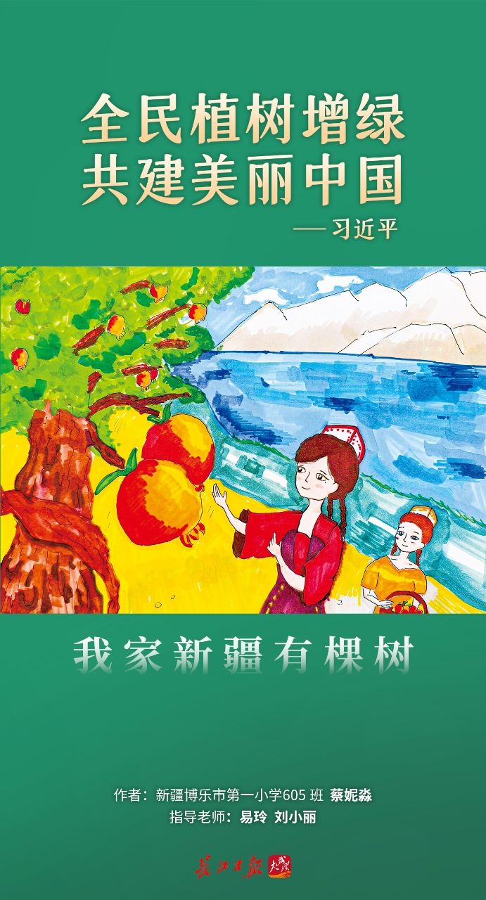 长江日报大武汉客户端3月12日讯(记者胡义华 实习生薛雨欣)“植一片青绿,唤醒那片荒芜;种一棵果树,守护那方厚土……我家新疆有棵树,拥抱春天开花,怀抱秋天成熟,每片叶子都跳动长江的音符……”
