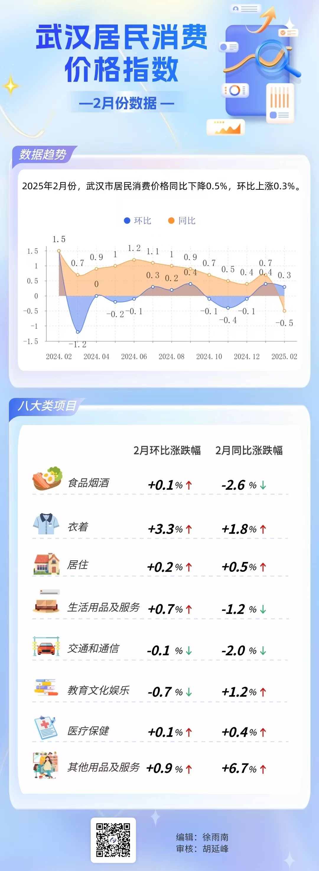 长江日报大武汉客户端3月12日讯 3月12日,记者从国家统计局武汉调查队获悉,2月份,武汉居民消费价格指数(CPI)同比下降0.5%,环比上涨0.3%,一些领域价格显现积极变化。