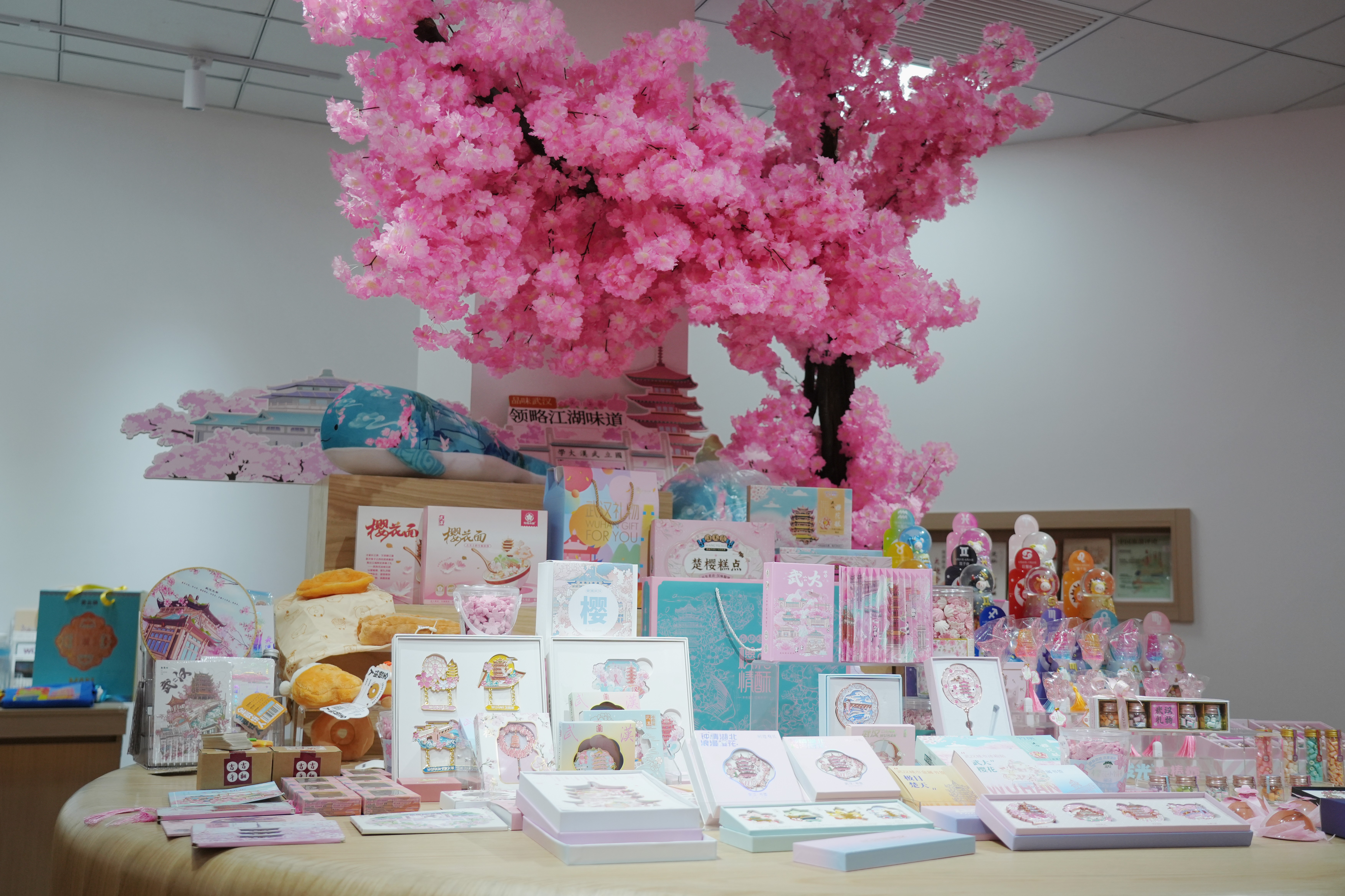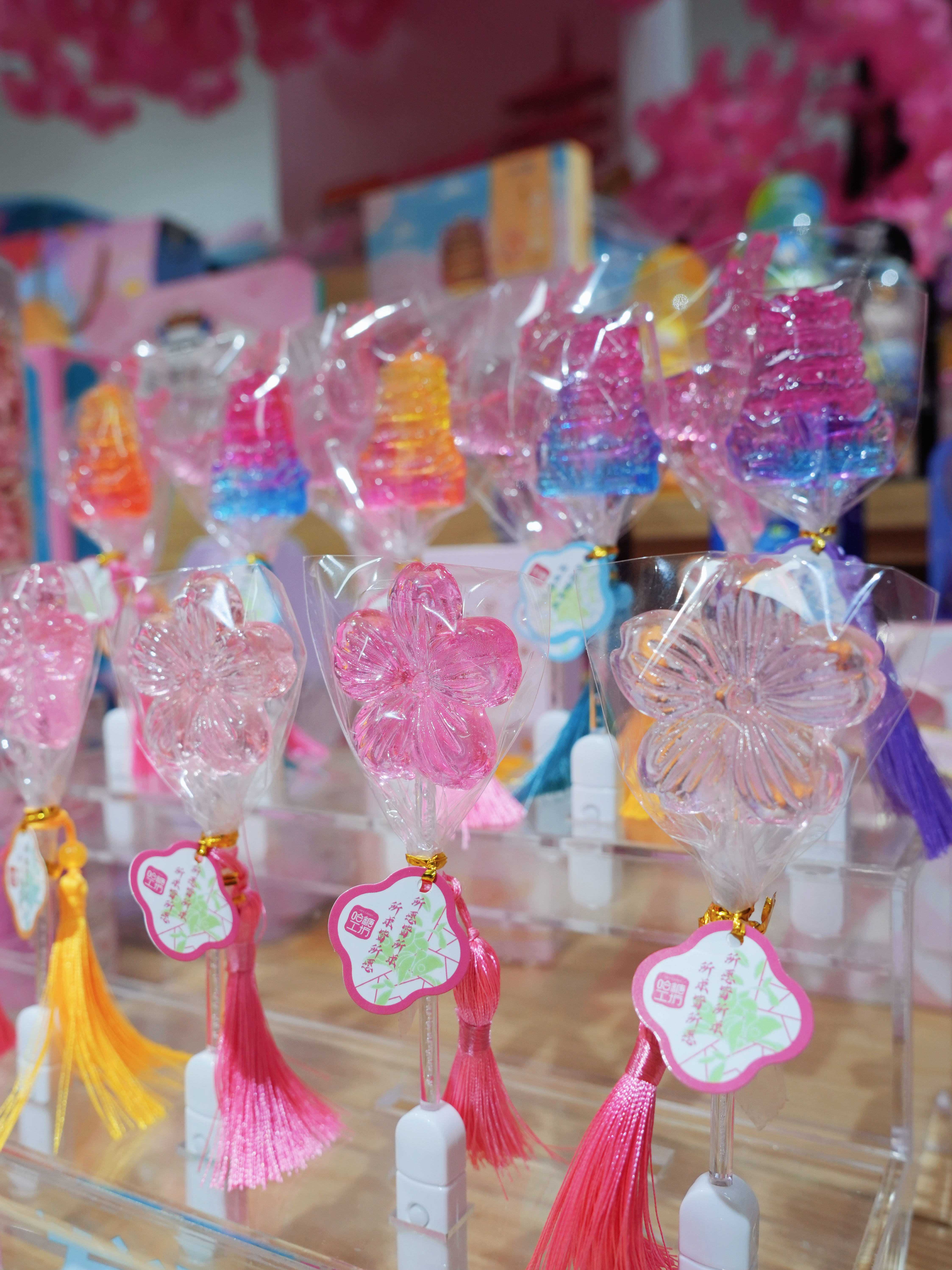 除了“蒜鸟”,武汉礼物文旅产业有限公司还推出了超多“樱花定制款”文创产品。杨博智介绍,今年的樱花季产品策划从去年12月底就开始筹备,3月份共上新了300多款樱花主题文创品。其中,樱花饼、樱花糕、樱花梳妆镜、樱花流沙·冰箱贴等产品备受欢迎。一只15元的樱花夜光棒棒糖单品销售额一年能达到300万元,其中超过70%的销量集中在樱花季期间,今年推出了不同的粉色系棒棒糖。