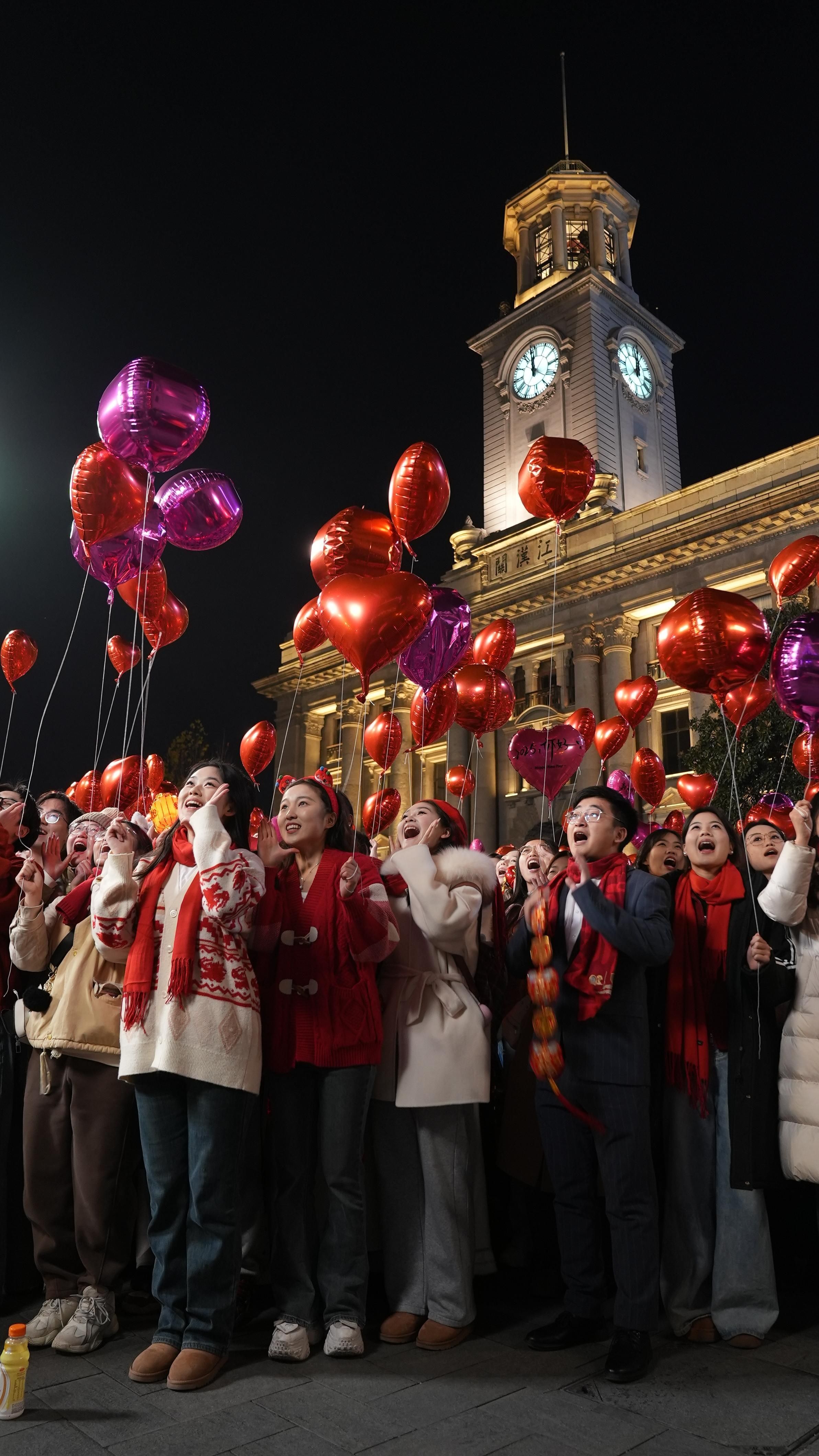 游客在吉庆街“跟着春晚来武汉·新春打卡来江岸”打卡装置前打卡。