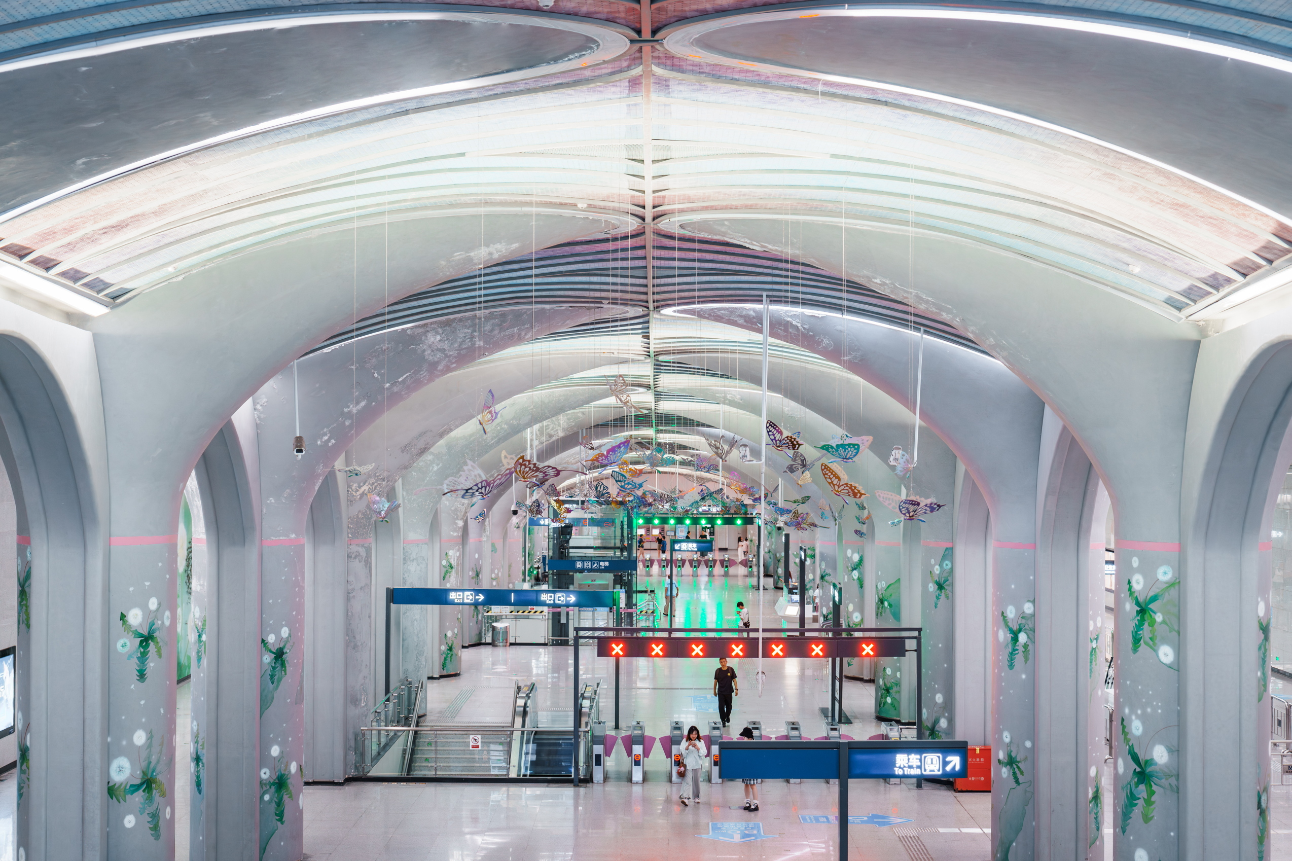 珞雄路站开通于2019年,是武汉地铁2号线南延线的一站,紧邻光谷广场、光谷世界城和华中科技大学。这座车站以“霓流花韵”为艺术主题,融合科技与自然元素,体现光谷“科技之谷”的定位。站内装饰以蒲公英和蝴蝶为核心元素,艺术墙绘制青翠草地与立体蒲公英造型,寓意“随风播种理想”,象征年轻人积极追逐梦想。