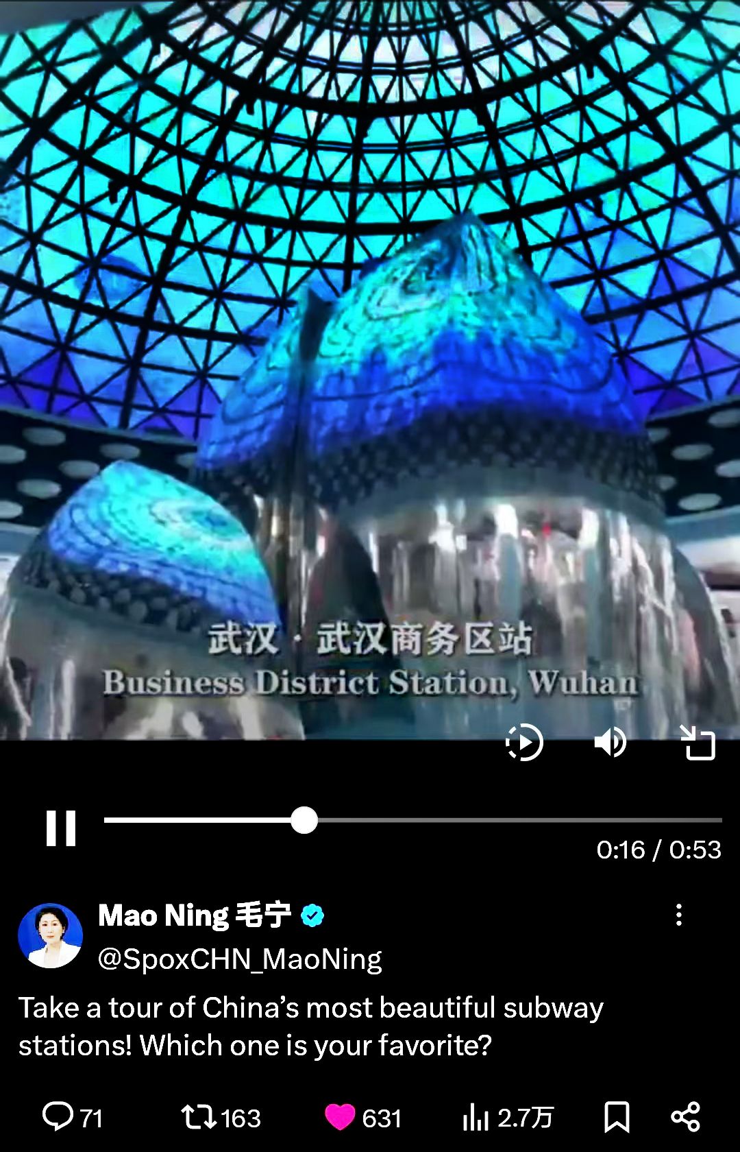 长江日报记者看到,视频全长52秒,分为现代之光、传统之美、自然之趣三个部分。地铁武汉商务区站、光谷空轨出现在现代之光篇章,珞雄路站、16号线出现在自然之趣篇章。毛宁配文:Take a tour of China's most beautiful subway stations!Which one is your favorite?(中国最美地铁站之旅,你最喜欢哪一个?)