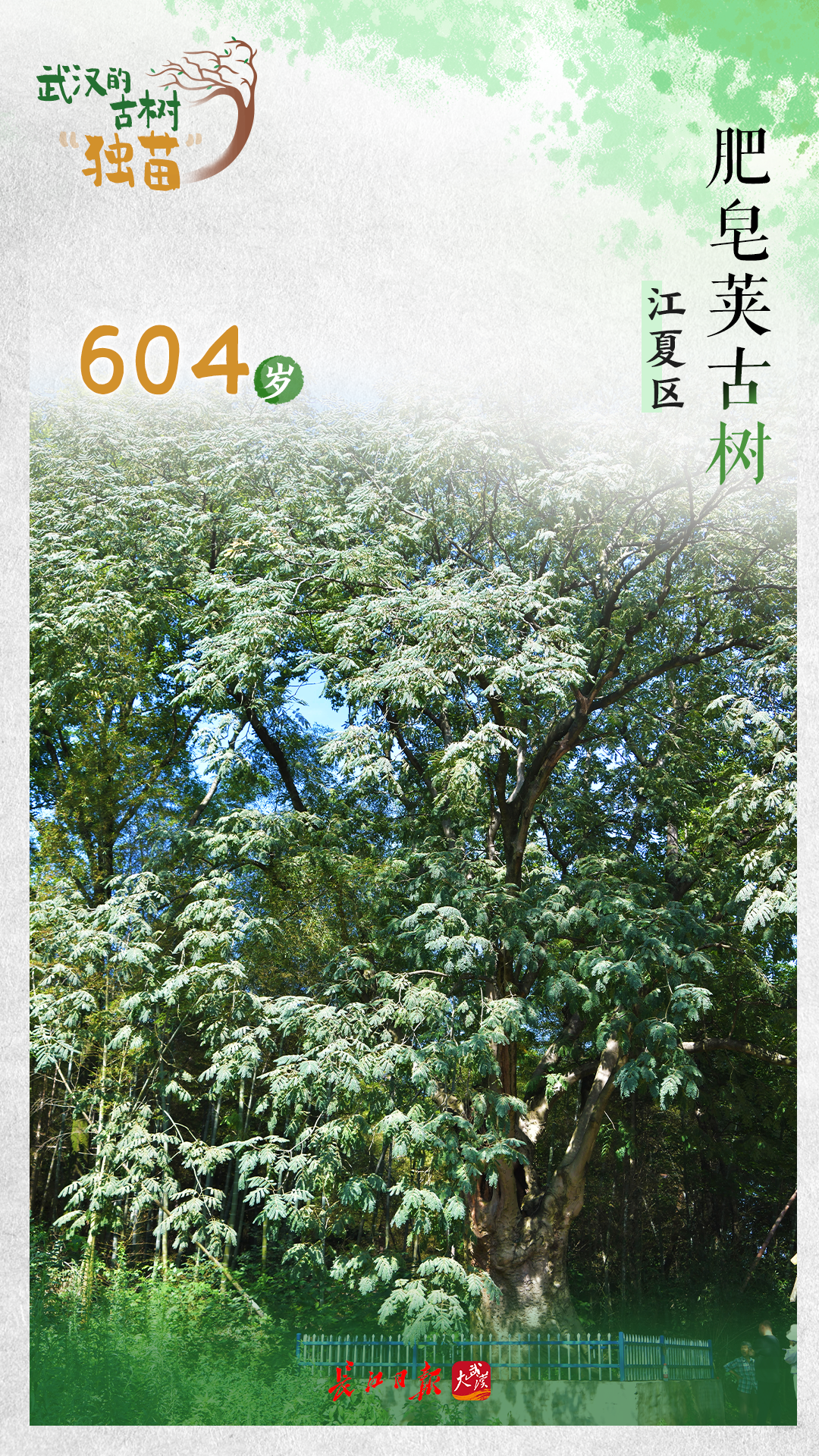 江夏区一株604岁的肥皂荚古树需4个成人才能合抱。武汉还有皂荚古树,一共76株。肥皂荚与皂荚虽只有一字之差,但外观明显不一样:皂荚树浑身长满尖刺,是个令人望而生畏的“刺儿头”,而肥皂荚树身上光溜溜的,很有亲和力。两种树结的果实都可以当肥皂洗衣服。