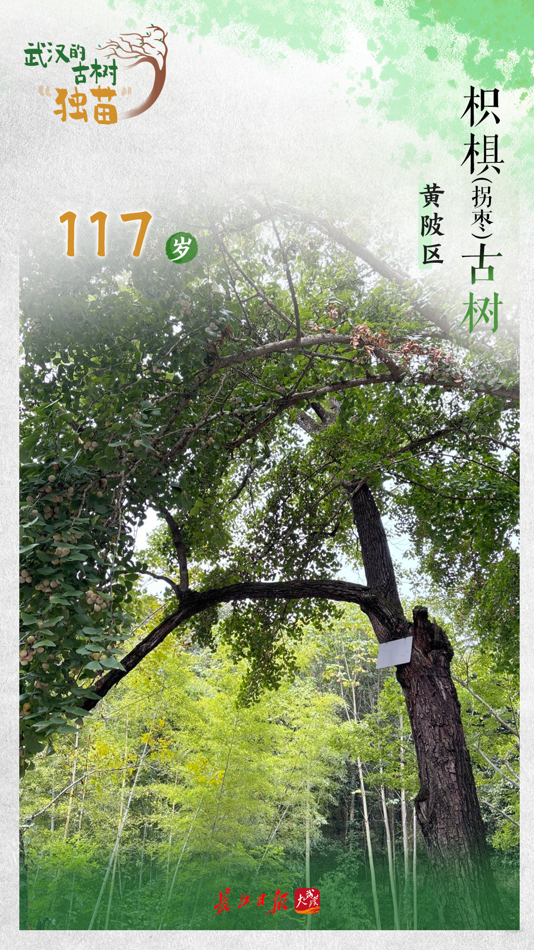黄陂区素山寺林场有一株树龄117年的枳椇,每年也结果。枳椇俗称拐枣,味道蜜甜。