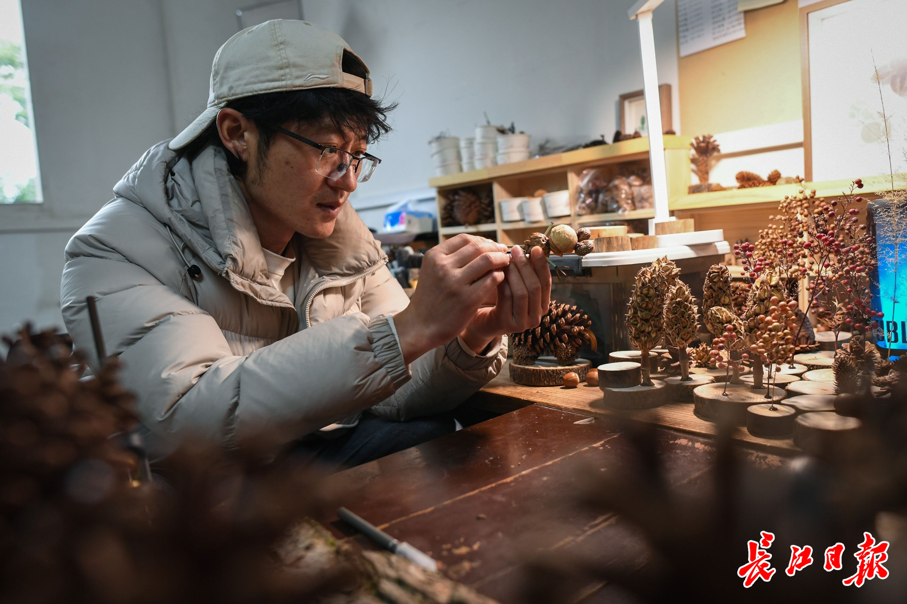 青岛人王怀祥在工作室内用松果制作手工摆件。 长江日报记者 史伟 摄
