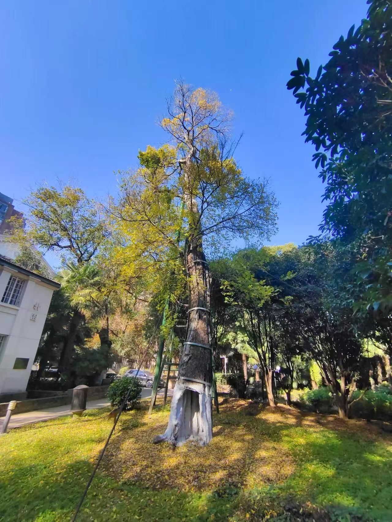 湖北省美术学院校园内有一株280年的朴树,树干中空,几乎只剩下一圈树皮,加上树身倾斜,随时可能断裂和倒伏。武昌区园林部门在专家指导下,为它量身定制了养护方案:使用直径10厘米—15厘米的钢管支撑,组装成一副人字形支撑架和斜拉绳索,让它稳稳地站立。如今,这株古树已长出新枝。