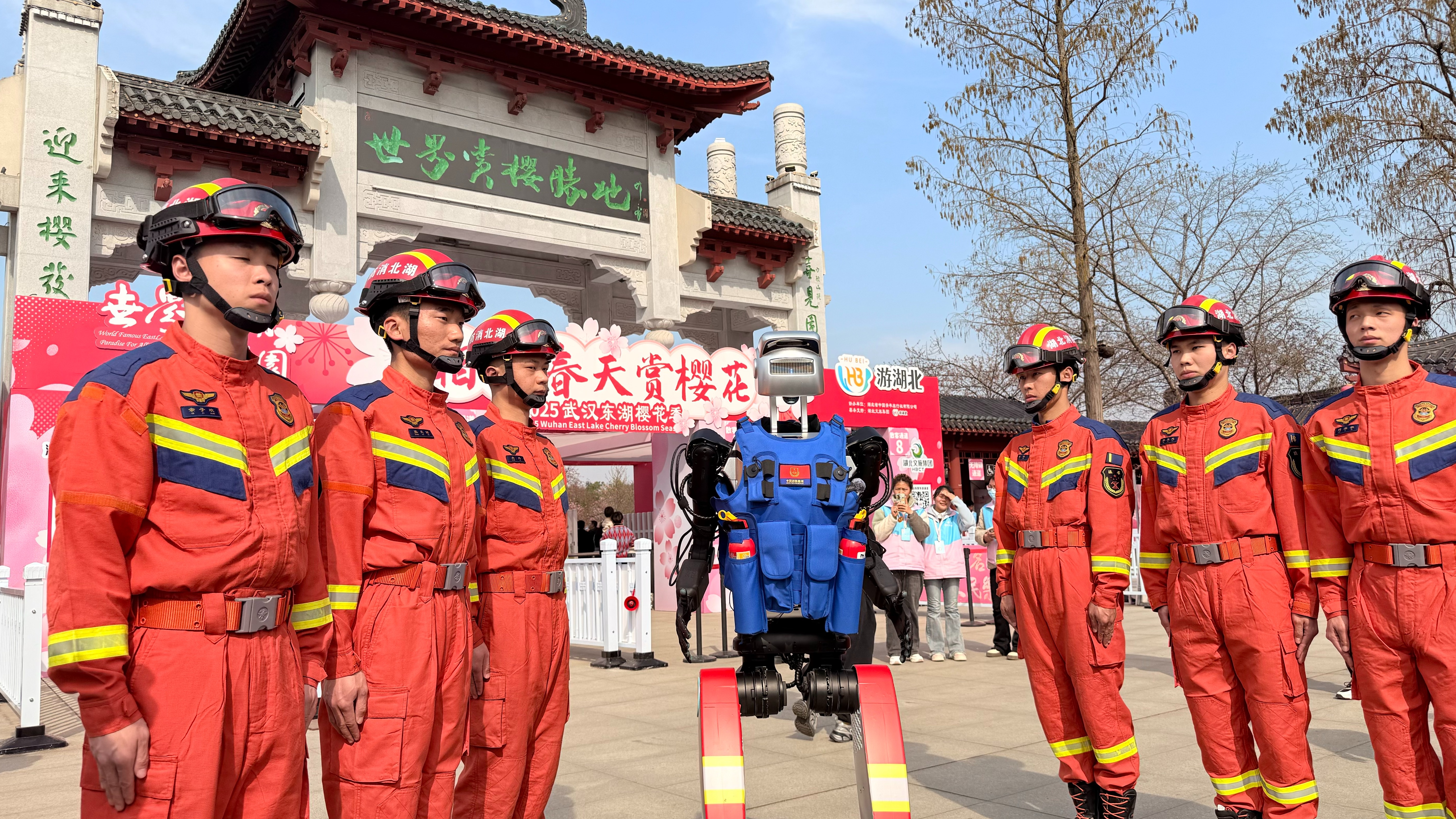科技感十足的消防机器人抵达东湖樱花园,将参与到景区消防安全保障工作中。 赵丽 摄