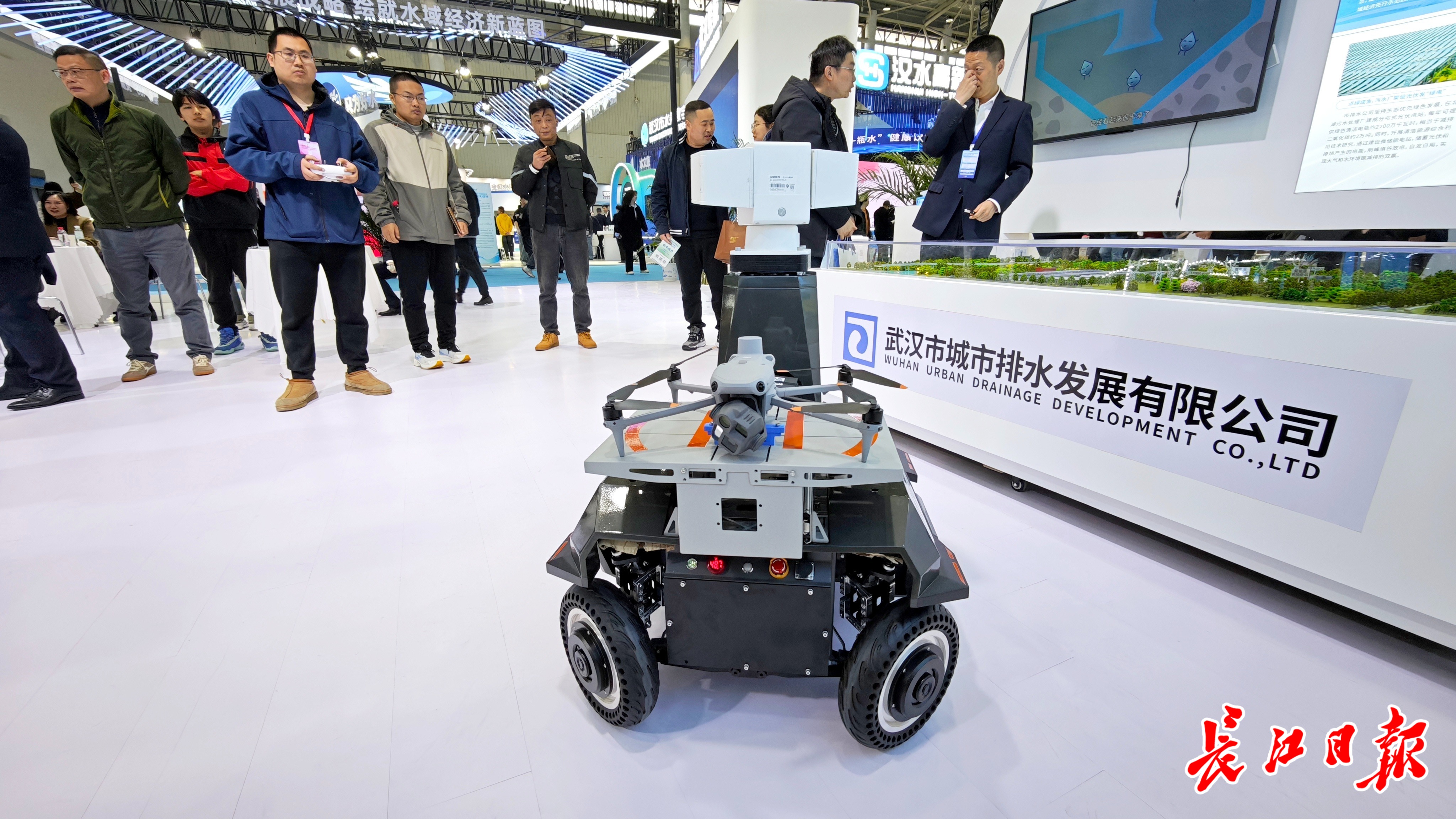 “它既可以地上走,也可以飞上天,‘空地协同’巡视污水处理厂”,在武汉控股武汉市城市排水发展有限公司展台,技术人员展示一款“麒麟机器人”,在场地上行动自如。只见这台机器人形似麒麟,四只轮子如同四脚,“头部”是一部云台摄像机,能四处张望,其“背部”无人机起降台上,一架无人机随时可起飞。