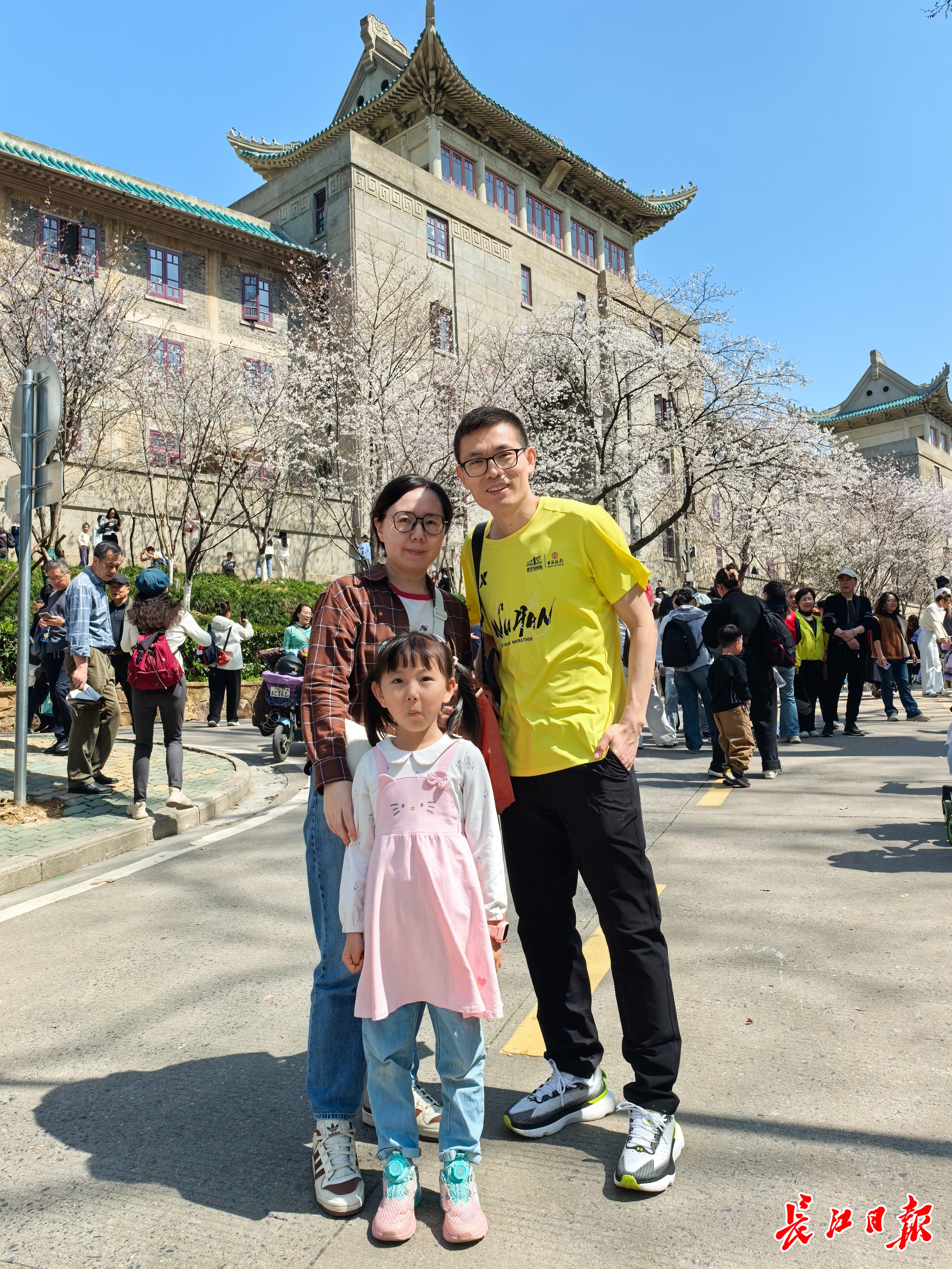 在樱花大道,长江日报记者偶遇李强一家,身穿汉马赛服的李强在人群中格外显眼。“我昨天采访过你们,还记得吗?”记者笑着和他们打招呼。李强也回忆了起来,20日上午在武汉国际会展中心领完参赛物资,他迎面碰上记者并接受了采访。