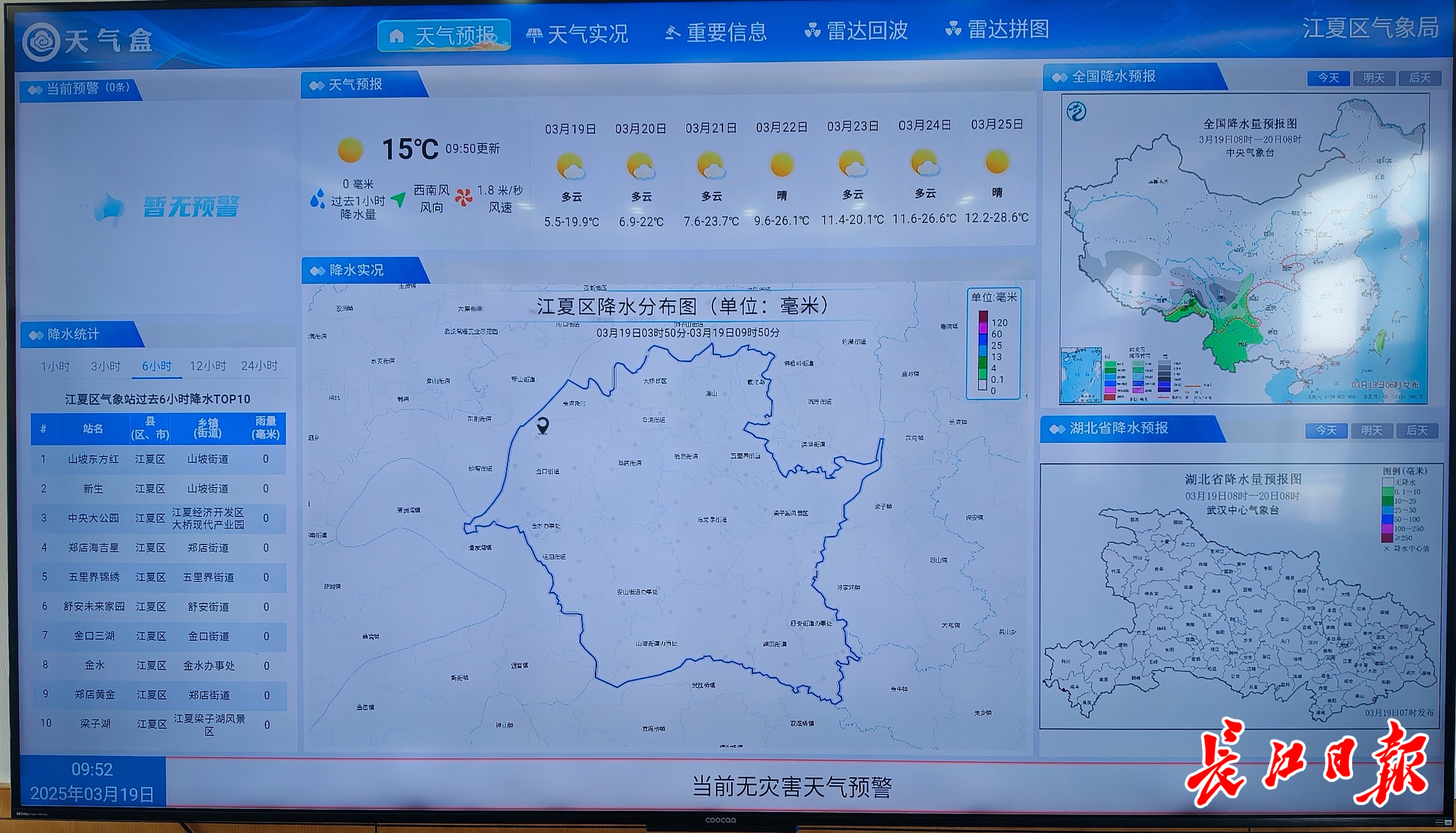 金口街的这个“天气盒”是在去年4月安装的,使用即将满一年。“天气盒”是湖北省气象局针对基层研发的气象预警信息接收终端,主要是基于气象部门新建的气象大数据平台,针对街道、乡镇等基层单位防汛救灾的需求,面向街道、乡镇防汛值班室,通过连接显示屏和网络,实现“一张图”实时调阅天气实况、预报预警、雷达卫星监测信息等功能,为基层单位准确调度防汛救灾赢得主动权。