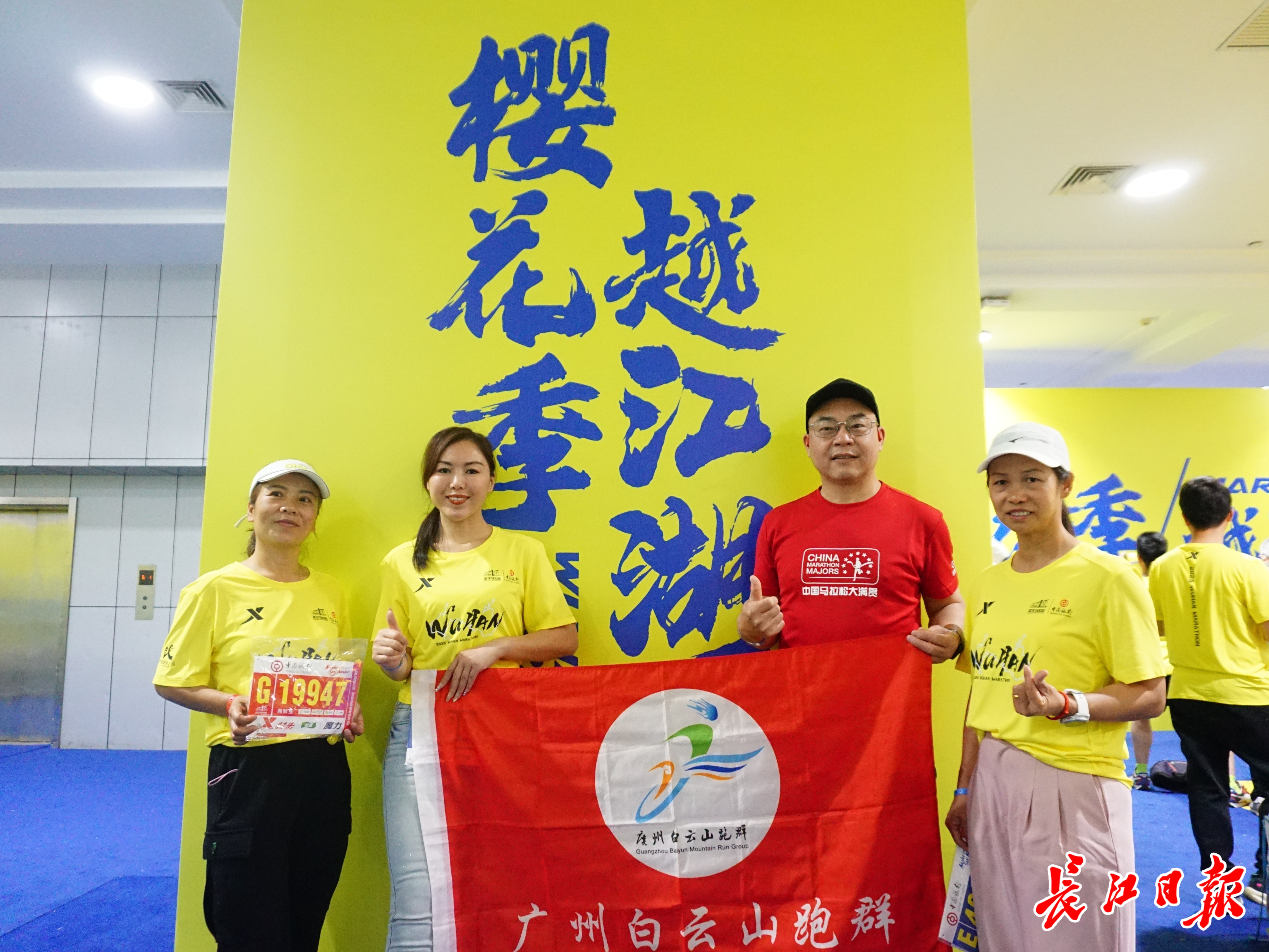 长江日报大武汉客户端3月22日讯(记者秦璟)“快给我们推荐推荐,武汉哪里好吃好逛?”3月22日,在汉马领物现场,来自广州白云山跑群的四位跑友正在“樱花季 越江湖”背景墙前合影留念。当长江日报记者上前采访时,他们热情地询问武汉的美食与游玩之地。