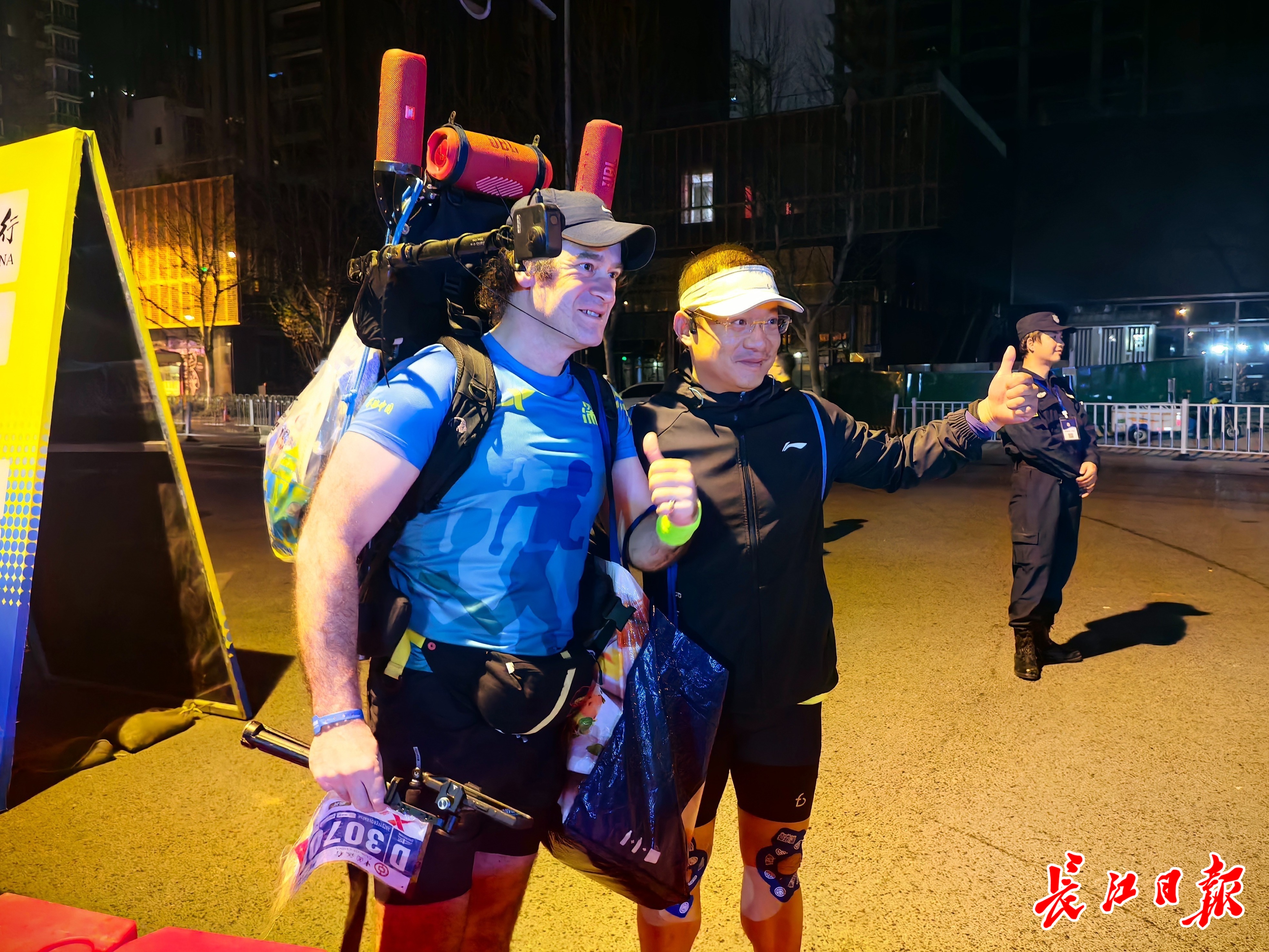 长江日报大武汉客户端3月23日讯(记者孙笑天)23日5时50分,武汉马拉松中山大道五福路选手入口,一位背着低音炮的外籍选手吸引了不少选手的目光。他叫阿辽沙,来自俄罗斯叶卡捷琳堡。