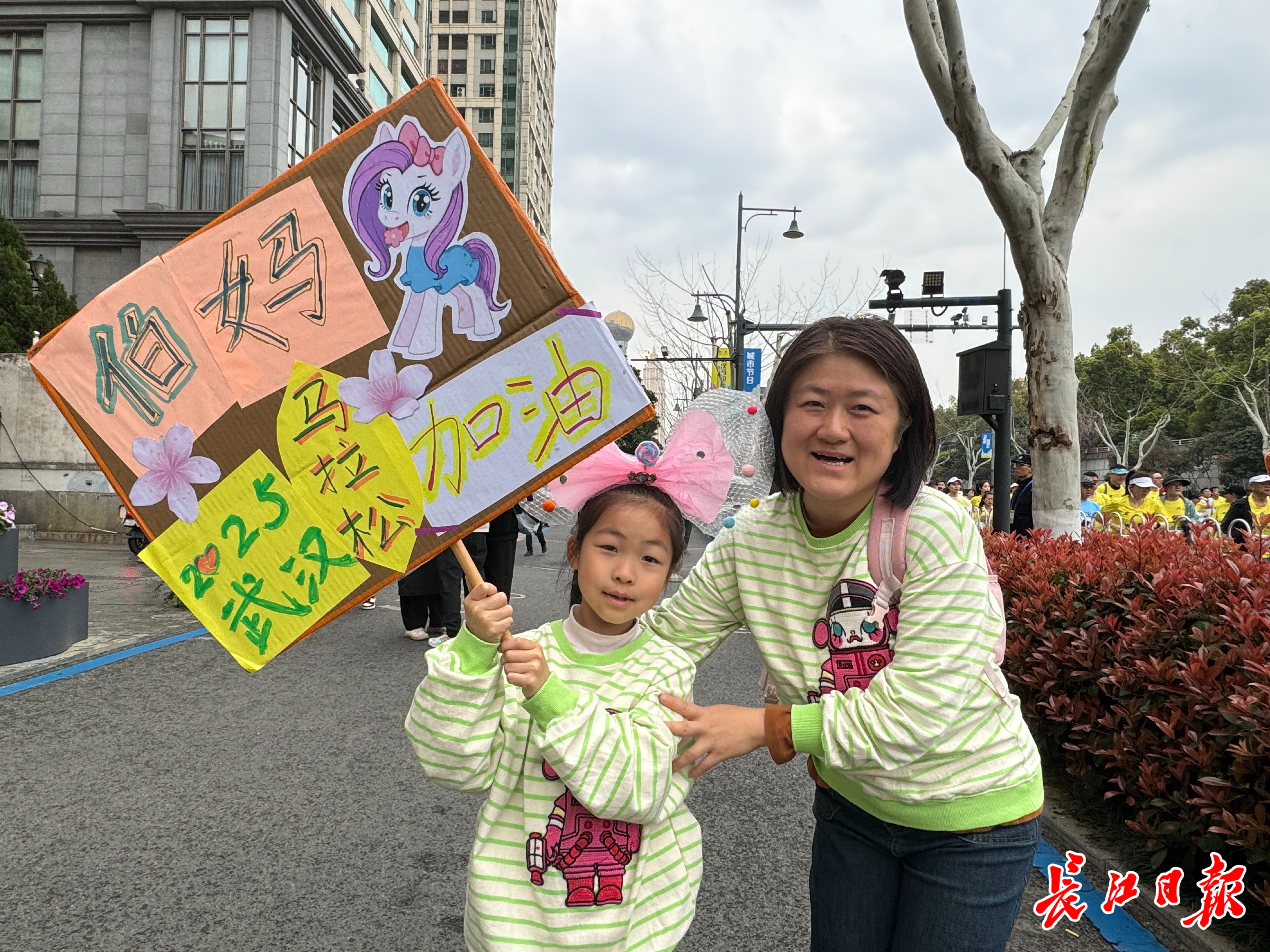 记者偶遇一位妈妈带着女儿正在为选手加油。“我在鄱阳街小学上二年级,今天是来为伯母加油的。”小女孩名叫郑习妍,她手里举着一块自制的手牌,上面画着樱花,写着“2025武汉马拉松,伯妈加油!”等字样,头上还戴着一个可爱的粉色蝴蝶结。