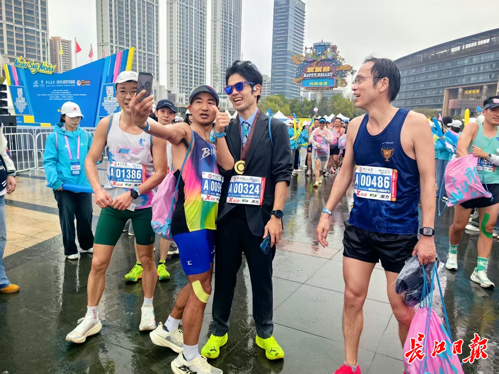长江日报大武汉客户端3月23日讯(记者孙笑天)墨镜、衬衣、领带、西装……3月23日10时许,汉马终点处,一名“去上班”打扮的选手吸引了不少选手合影。这位选手来自日本,因身穿西装跑马拉松出了名,被网友们称作“西装大叔”,这也成了他的网名。