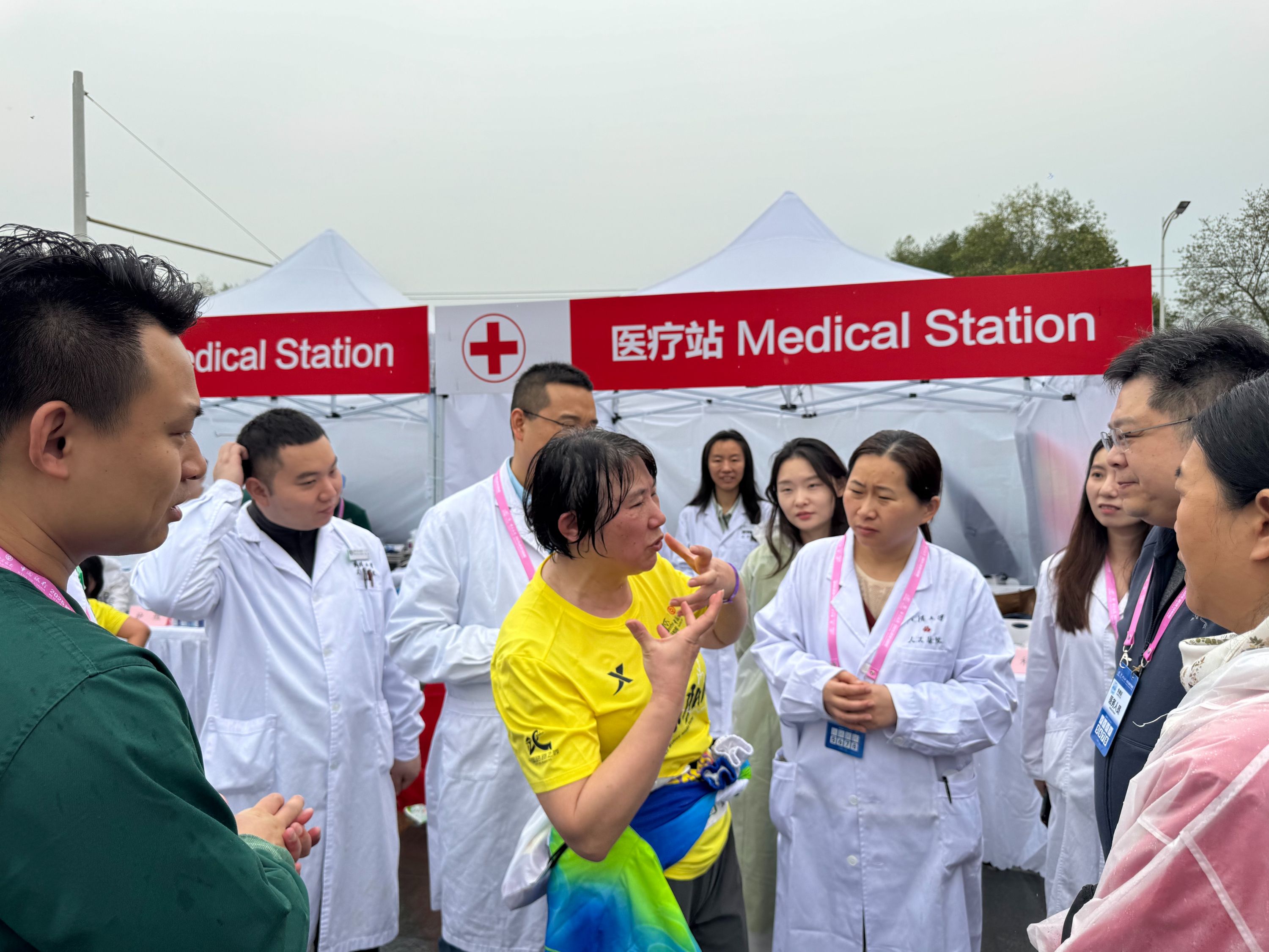 除了詹丽云教授,“人民医护跑团”一路护航跑友。儿科医生陈江南完成全马,途中为抽筋跑友提供现场指导;麻醉科护师徐勇、医学工程师袁加国化身“移动急救员”,随身携带急救物资陪跑全马;肿瘤科阮莎莎教授作为本次汉马的官方“急救跑者”,与医疗站全程联动。