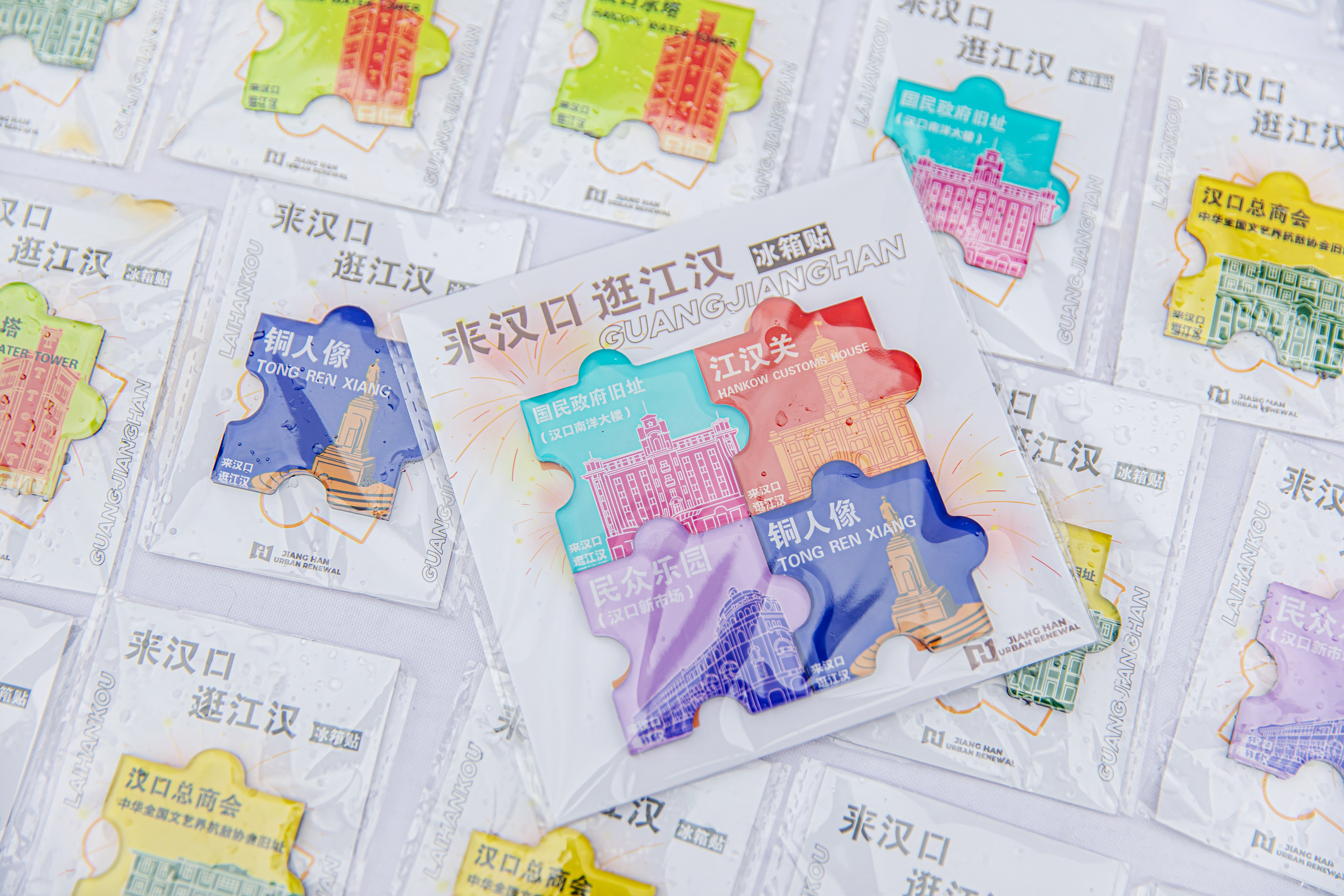 记者在现场看到,这套冰箱贴选取了江汉关、铜人像、汉口水塔、民众乐园、南洋大楼及汉口总商会六大江汉区地标建筑,将江汉城市地标群拼成一幅多彩的建筑文化图谱。